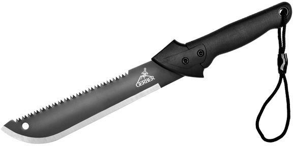 Maczeta Gator Junior firmy Gerber to poręczne narzędzie, które z powodzeniem możemy zmieścić się w plecaku podczas wszelkich extremalnych wypadów w teren. Ostrze o długości 273 mm wykonano z trwałej stali węglowej, pokrytej czarną warstwą antykorozyjną. Wykorzystana stal węglowa dobrze utrzymuje ostrość, łatwo ją naostrzyć w terenie, a dzięki wysokiej elastyczności jest również odporna na odkształcenia. Grzbiet głowni posiada prawie na całej swej długości w pełni funkcjonalną piłę, która bez problemu poradzi sobie z grubymi konarami drewna. Ergonomiczną rękojeść maczety Gator Junior wykonano z elastycznego tworzywa, dobrze tłumiącego wstrząsy, oraz zapewniającego pewny i wygodny chwyt. Chwyt jest na tyle długi, że z powodzeniem można oburącz operować maczetą. W zakończeniu chwytu znajduję się otwór, przez który przewleczona jest linka zabezpieczająca. Do transportu maczety przy pasie, służy wzmacniany pokrowiec wykonany z balistycznego nylonu, odpornego na udar mechaniczny i działanie pleśni. Maczeta Gator Junior bezprecedensowo dyskwalifikuje większość rynkowej konkurencji i tworzy nową jakość w kategorii maczet.