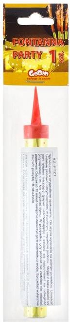FONTANNA, RACA TORTOWA na tort: urodzinowy, ślubny, weselny. Fontanna tortowa to idealny dodatek do urodzinowego tortu! Doskonale się także sprawdzi na torcie weselnym! Opakowanie zawiera 1 szt. Wysokość: 12 cm Średnica: 15 mm Fontanna na tort posiada plastikową końcówkę, dzięki której utrzymuje się w pionie na torcie. W celu odpalenia fontannę należy umieścić pionowo, następnie zapalić papier uszczelniający i niezwłocznie oddalić się na odległość ok.1 m. Z fontanny tortowej sypią się w górę złoto-srebrne iskierki. Do artykułu dołączona jest instrukcja obsługi. Produkt nie przeznaczony do użytku przez osoby poniżej 18 roku życia. Przepiękna raca - fontanna tortowa, która doskonale się będzie prezentować podczas urodzin, świętowaniu rocznicy lub na torcie weselnym!