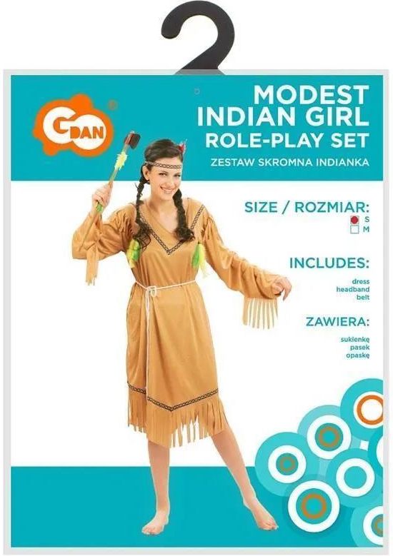 Strój skromna indianka Zestaw zawiera: sukienka, pasek, opaska Rozmiar: S Kolor: beżowy Ilość: 1 szt. Producent: Godan EAN: 5902973199727
