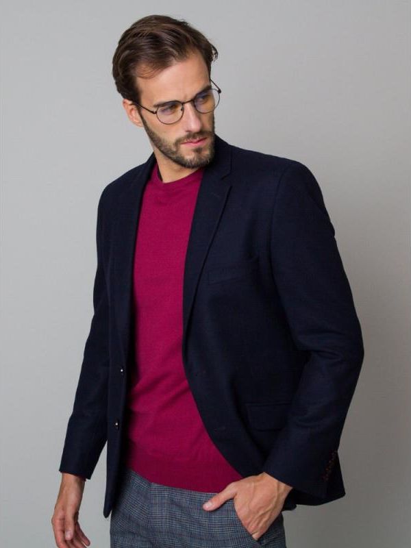 Klasyczna marynarka Gładkie marynarki pasują na typowe casualowe wyjścia. Poprzez ich gładką fakturę można je zestawiać z mocnymi kolorami i deseniami koszul. Dodatkowe informacje Marynarka w kolorze granatowym Tkanina o gładkiej fakturze Kieszenie z klapami Zapinana na dwa guziki Czerwone guziki z granatową obwódką Klasyczna kieszeń na piersi Posiada klasyczną podszewkę Skład marynarki 70% wełna 30% poliester Skład podszewki 100% wiskoza