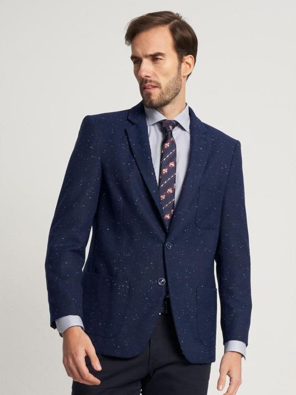 Letnia marynarka z lnu naturalnego Marynarki uszyte z domieszką lekkich tkanin w odcieniach niebieskiego, grafitu i szarości. Pasują na typowe casualowe wyjścia, a dzięki ich fakturze można je zestawiać z mocnymi kolorami i deseniami koszul. Dodatkowe informacje Marynarka w delikatne kropki Głębokie kieszenie bez klap Zapinana na dwa guziki Klasyczna kieszeń na piersi Granatowa podszewka z wiskozy Producent: Willsoor Gwarancja: 24 m-ce Skład marynarki 70% poliester 15% wiskoza 15% wełna naturalna Skład podszewki 100% wiskoza