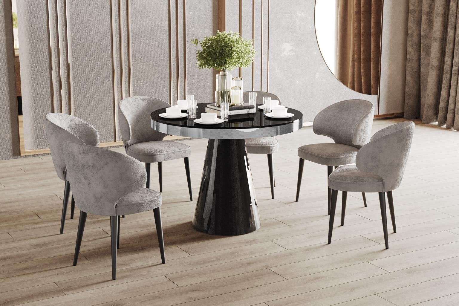 Stół TOLEDO GLAM to elegancki, okrągły stół, który doskonale sprawdzi się podczas codziennych posiłków i kameralnych spotkań. Dzięki kompaktowym wymiarom oraz przemyślanej formie, model ten świetnie odnajdzie się zarówno w mniejszych jadalniach, jak i nowoczesnych salonach. Blat o średnicy 100 cm został wykończony efektowną, subtelnie prążkowaną lustrzaną krawędzią, która dodaje całości wyrafinowanego charakteru i podkreśla stylistykę glamour. Stabilna podstawa w formie kolumny – ściętego stożka – zapewnia wygodę użytkowania oraz optymalną ilość miejsca dla osób siedzących przy stole. Połączenie nowoczesnej formy z eleganckimi detalami sprawia, że TOLEDO GLAM jest uniwersalnym rozwiązaniem do różnych typów wnętrz – od prywatnych mieszkań po stylowe przestrzenie komercyjne. Materiał Produkt wykonany jest z najwyższej klasy materiałów wykończeniu: Super POŁYSK, płyty mdf pokrytej matą akrylową w wykończeniu lustrzanego połysku. Cały mebel wykonany jest na wysoki połysk. Super MAT, płyty mdf pokrytej matą akrylową dający efekt głębokiego, aksamitnego matu. Wszystkie materiały cechuje podwyższona odporność na zarysowania i na działanie czynników UV oraz odporność termiczna do 100 stopni C. Zaleca się czyszczenie i pielęgnację wilgotną mikrofibrą bez dodatku detergentów. Dziękujemy, że wybierasz POLSKI PRODUKT Mebel jest projektowany i produkowany w Polsce z wykorzystaniem wysokiej jakości europejskich komponentów, co gwarantuje wysoki standard wykonania oraz kontrolę jakości na każdym etapie produkcji. Solidna konstrukcja, starannie dobrane materiały i precyzja wykonania sprawiają, że mebel zachowuje swoją estetykę i funkcjonalność przez wiele lat.
