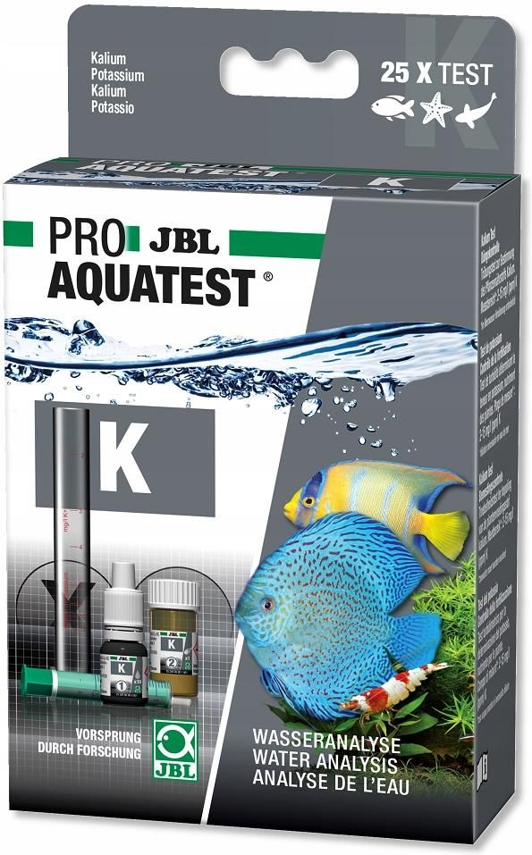 ProAqua Test na potas K JBL producent: JBL Opis JBL Potassium Test K to test potasowy służący do pomiaru i rutynowej kontroli zawartości potasu w słodkiej wodzie akwariowej, w przedziale między 2 – 15 mg/l (ppm). W wodzie morskiej zawartość potasu znajduje się w przedziale ok. 390 - 400 mg/l i jest zużywany tylko w niewielkich ilościach. Zbyt wysokie wartości potasu stanowią zagrożenie dla wrażliwych zwierząt, takich jak np. krewetki. Dlaczego należy kontrolować zawartość potasu? Potas jest jednym z makroelementów, które są szybko i efektywnie (w przeciągu kilku godzin) pobierane przez rośliny w wodzie słodkiej i przez pewien czas magazynowane. W przypadku roślin wzrastających zapotrzebowanie na potas jest wyższe w porównaniu z innymi składnikami odżywczymi. Dlatego też potas może spaść szybko do minimum, mimo regularnego (np. cotygodniowego) nawożenia wody akwariowej. Powoduje to zatrzymanie wzrostu roślin. W wodzie bieżącej potas jest, w porównaniu z naturalnym środowiskiem, elementem występującym w niedoborze, szczególnie w porównaniu z wapniem i magnezem. Polecamy na początek codzienny pomiar zawartości potasu w Państwa akwarium. W ten sposób można dokładnie określić potrzeby roślin i odpowiednio dozować nawożenie. Z czasem można przejść do rutynowej kontroli w większych odstępach czasu. W celu uzyskania dobrego wzrostu i rozwoju roślin wartość potasu powinna znajdować się w rekomendowanym przedziale między 5 a 10 mg/l. W akwariach intensywnie oświetlanych, od ok. 1 W/l zawartość potasu powinna leżeć w przedziale 10 - 20 mg/l. Wyższe wartości potasu sprzyjają rozrostowi niepożądanych, zielonych glonów - wiciowców. Galeria produktu