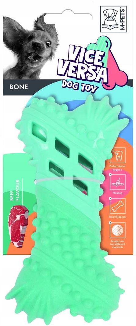 *Gryzak Vice Versa Bone* to zabawka o aromacie wołowiny. Pyszny aromat wołowiny przyciąga uwagę psa i zachęca do żucia. * Dozownik smakołyków. * Zabawka pływająca w wodzie. * Idealna do higieny zębów. * Połączenie twardego i miękkiego w dotyku materiału. *Wymiary:* 4,22x8,51x15,88cm.