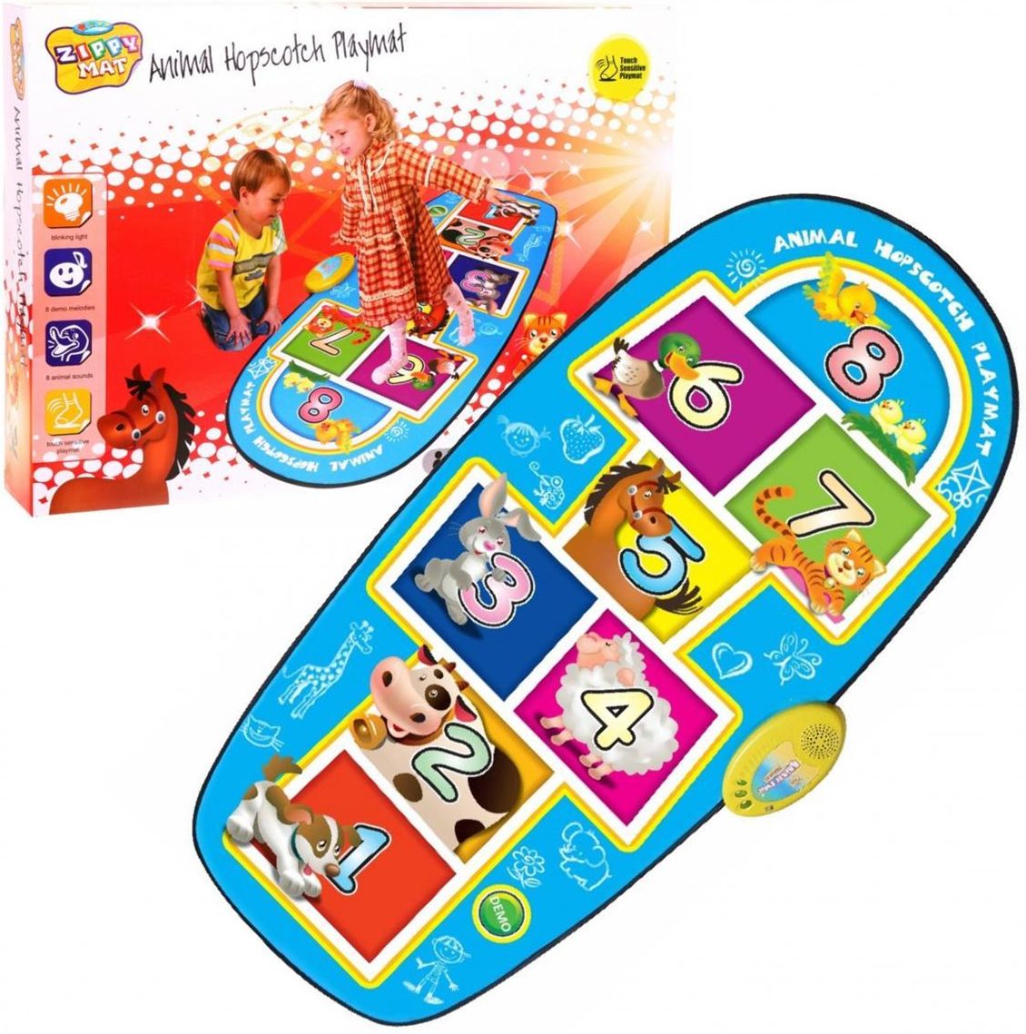 MADEJ Mata gra w klasy - Zwierzątka 138x59 cm Mata Gra w klasy - Zwierzątka B/O 138x59 cm Mata umożliwia dzieciom taniec poprzez nadeptywanie klawiszy pianina na macie. Jest to świetna zabawa, umożliwiająca również rozwijanie inteligencji dzieci, ich kreatywność i reakcje na bodźce zewnętrzne. Nr katalogowy: 009393 Wymagania wiekowe: 3 lat Płeć: Chłopcy,Dziewczynki Produkt na baterie: Tak Zasilanie : Baterie Kolor: Wielokolorowy Wymiary: 138 x 59 cm Bezpieczeństwo: Ze względu na budowę i cechy funkcjonalne zabawka przeznaczona dla dzieci w wieku powyżej 3 lat. Nie używać blisko uszu, niewłaściwe użycie może spowodować uszkodzenie słuchu.