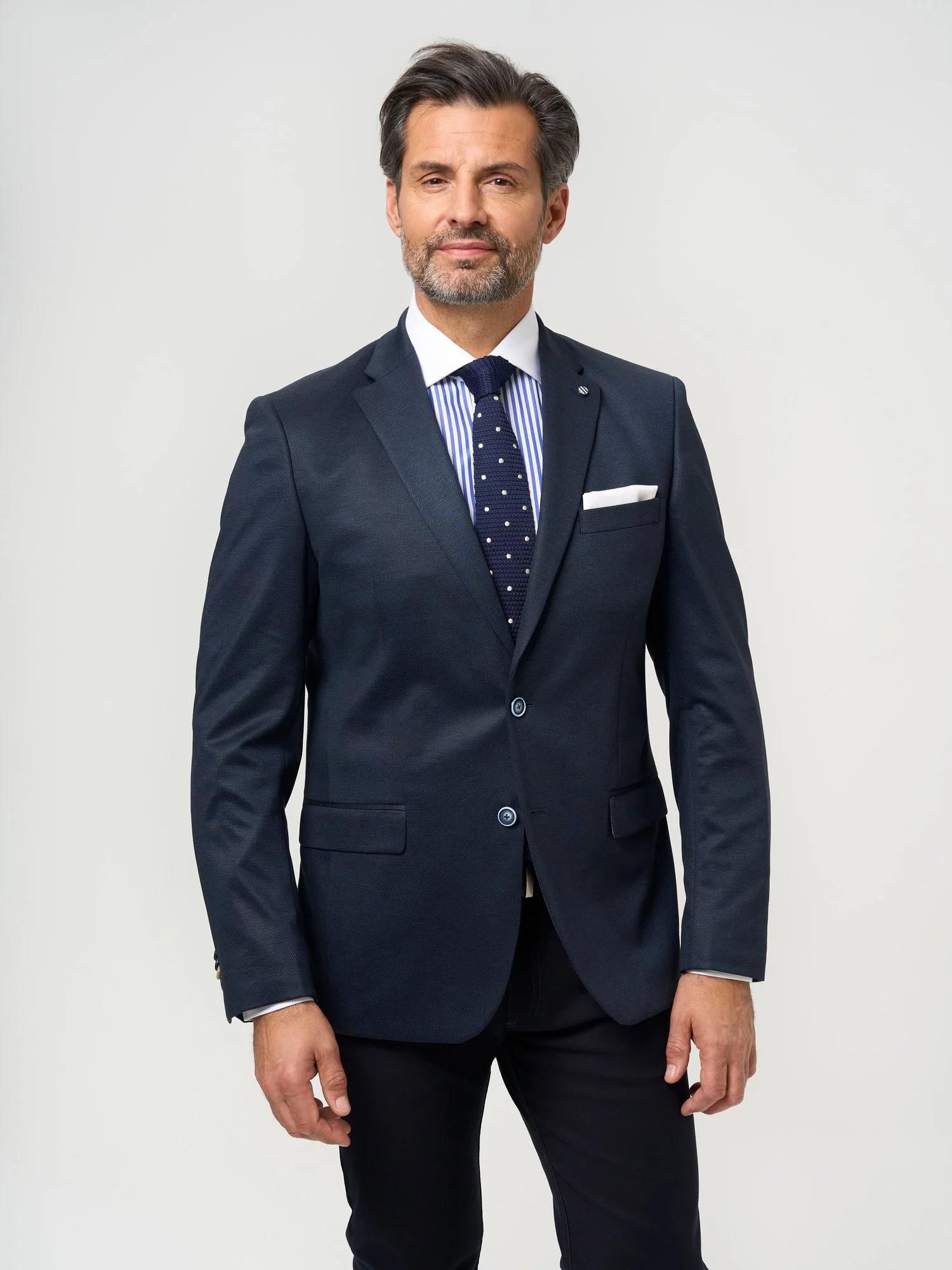 Klasyczna marynarka Gładkie marynarki pasują na typowe casualowe wyjścia. Poprzez ich gładką fakturę można je zestawiać z mocnymi kolorami i deseniami koszul. Dodatkowe informacje Marynarka w kolorze granatowym Tkanina w delikatny przeplot Głębokie kieszenie bez klap Zapinana na dwa guziki Klasyczna kieszeń na piersi Klasyczna podszewka Kolorowe detale Producent: Venti Gwarancja: 24 m-ce Skład marynarki 79% poliester 15% bawełna 6% elastan Skład podszewki 100% poliester