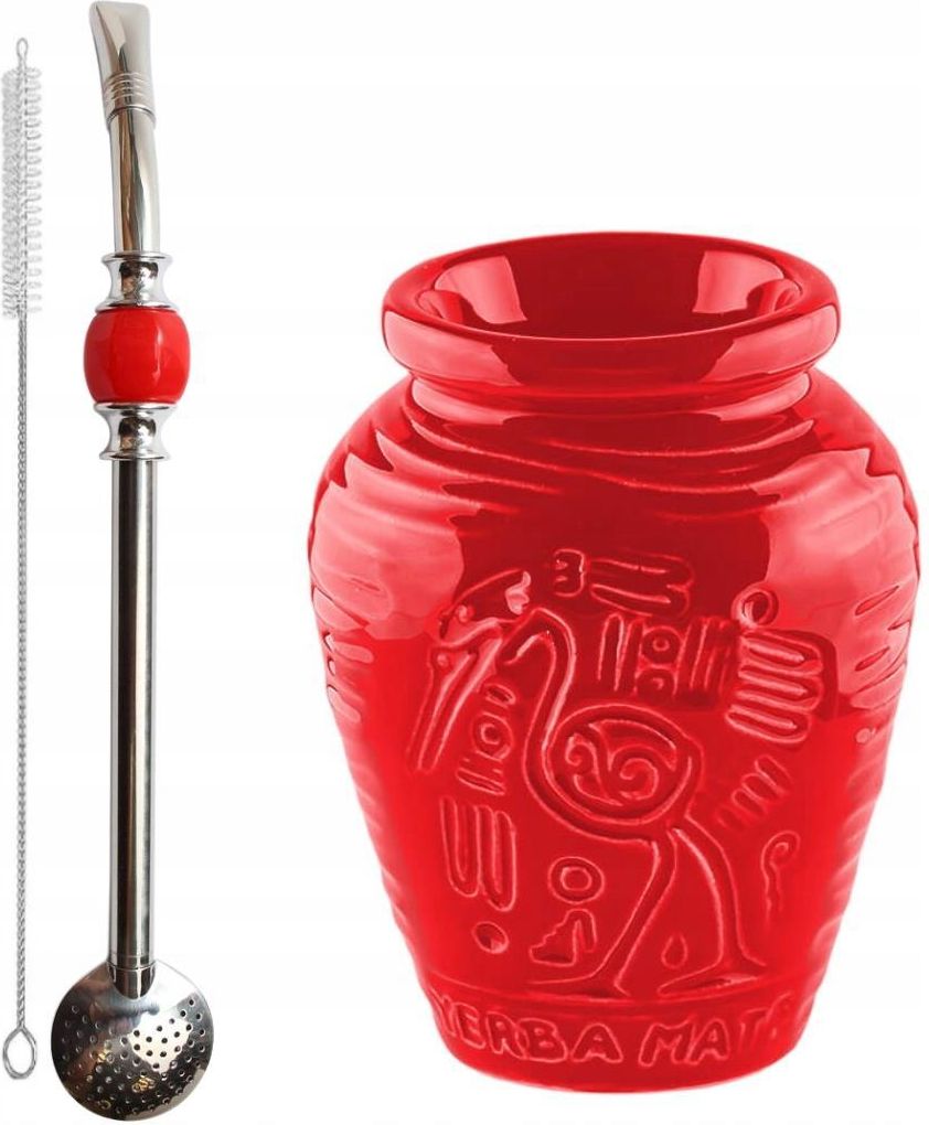 Zestaw Matero Yerba Mate Ceramiczne Aztek + Bombilla z Czyścikiem Zestaw do yerba mate Aztek to idealny wybór dla początkujących i miłośników tradycji! W komplecie znajduje się ceramiczne matero z efektownym wzorem inspirowanym kulturą Azteków oraz stalowa bombilla z czyścikiem. Matero jest łatwe w czyszczeniu i odporne na temperaturę, a bombilla skutecznie filtruje fusy, zapewniając czysty napar. W zestawie znajduje się Matero aztek czerwone - 300ml Bombilla Bola z kamieniem chłodzącym 21cm - czerwona Matero AZTEK Czerwone - 300ml Czerwone matero ceramiczne AZTEK. Niezbędnik każdego zarówno początkującego, jak i wytrawnego mateisty. To naczynie wykonane z najwyższej jakości ceramiki sprawi, że picie yerby będzie jeszcze przyjemniejsze i prostsze niż kiedykolwiek wcześniej! Duża pojemność oraz wypukłe wzory sprawiają, że jest to niezwykle wygodne do użytkowania matero. Must have mateisty! Będzie Ci niezawodnie towarzyszyć podczas kosztowania naprawdę wielu naparów z ostrokrzewu paragwajskiego! Główną zaletą matero ceramicznego jest to, że nie trzeba o nie nad wyraz dbać. Wystarczy spłukać go wodą. Polecany dla początkujących osób oraz tych, które nie mają czasu na pielęgnację tykwy. Jest cięższe niż tykwa, przez co lepiej leży w dłoni. Nie poci się jak tykwa. Materiał: ceramika Pojemność: 300 ml Kolor : Czerwony Wyprodukowane w Polsce. Bombilla Bola - Czerwony kamień Opis produktu Stalowa Bombilla do Yerba Mate z ozdobnym kamieniem. W zestawie znajduje się szczoteczka do usuwania nieczystości ze środka rurki. Zestaw zapakowany jest w białe pudełko z okienkiem. długość: 21cm kolor kamienia: czerwony