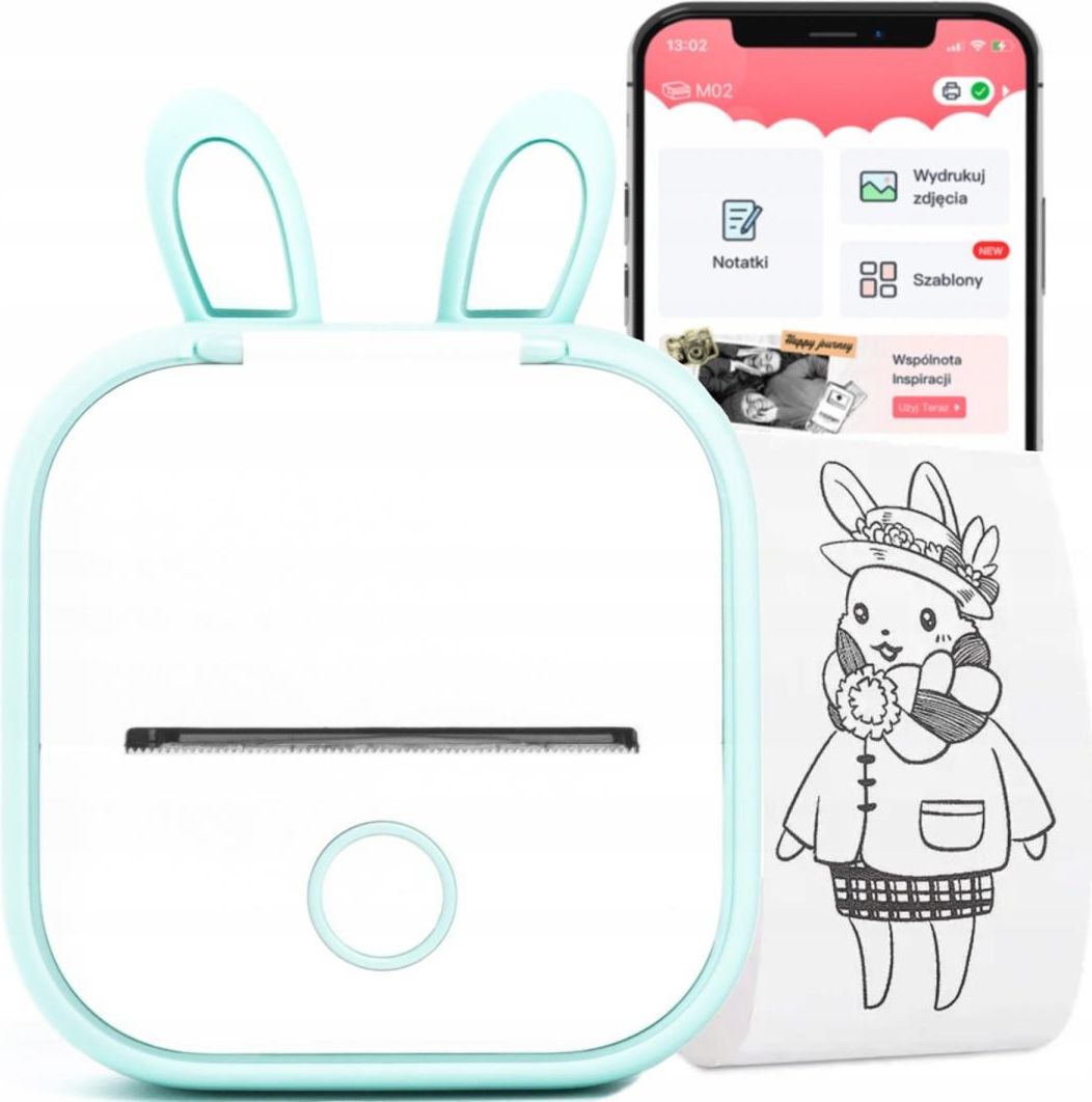 Wejdź na wyższy poziom estetyki! Wybierz swój wariant kolorystyczny i ciesz się mini drukarką Phomemo T02 RABBIT, która wesprze Cię w kreatywnym tworzeniu. Dla kogo jest mini drukarka Phomemo T02 RABBIT? Mini drukarka Phomemo T02 to mini drukarka, która idealnie sprawdzi się dla uczniów i studentów do notatek, pomoże uchwycić wyjątkowe chwile na wydrukowanej fotografii i stworzy materiały do scrapbookingu i kartek okolicznościowych. Tworzysz planer we własnym stylu (bullet journal)? Ta drukarka jest właśnie dla Ciebie! Co zawiera zestaw? Drukarka Phomemo T02 w kolorze zielonym Etui - uszka króliczka w kolorze zielonym Papier termiczny z klejem + uchwyt o szerokości 50 mm Kabel USB Instrukcja w języku polskim Drukuj prosto z telefonu! Pomimo niewielkiego rozmiaru, urządzenie charakteryzuje się wyraźnym, czarno-białym wydrukiem, po którym można pisać i kolorować(z wyjątkiem foliowych taśm). Świetnie do tego sprawdzą się na przykład markery Sharpie. Dzięki technologii termicznej, możesz zapomnieć o kupowaniu i wymianie tuszu. W drukarce znajduje się bateria litowa, która gwarantuje nawet tydzień czuwania po pełnym naładowaniu. Najważniejsze cechy drukarki Materiały eksploatacyjne: Q12 - papier i folia termiczna Szerokość obsługiwanych taśm: 50/53mm Maksymalna szer. wydruku: 48mm Rozdzielczość: 203 DPI Komunikacja: Bluetooth Wbudowany akumulator: 1000mAh Ładowanie: kabel USB WYMIARY/WAGA Waga z opakowaniem: 321g Wymiary: ‎87 x 90 x 40 mm **Drukarka nie służy do drukowania etykiet kurierskich** GWARANCJA SPRZEDAWCY 12 miesięcy