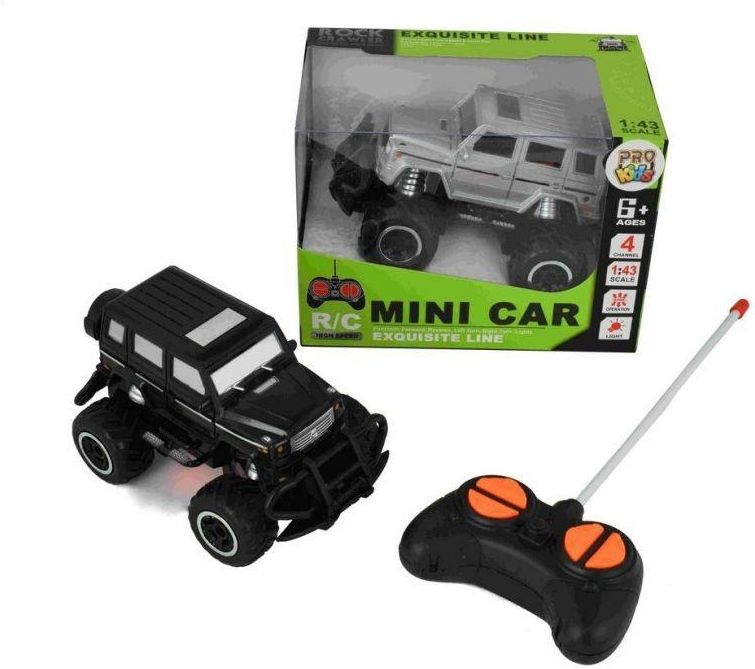 Samochód zdalnie sterowny Jeep. Zabawka na baterie. Auto jeździ do przodu/tyły w prawo/lewo. Wspaniała zabawka do nauki jazdy pojazdami zdalnie sterowanymi. Samochód zdalnie sterowny na fale radiowe z pilotem 4-kanałowym. Samochód zasilany przez baterie. Zabawka z efektami świetlnymi. Skala samochodu 1:43. Auto na baterie 2xAA 1,5V (nie załączono). Różne kolory, towar wysyłany losowo. Wymiary: 14x8,5x7,5 cm Grupa wiekowa: 6+ Opakowanie: pudełko