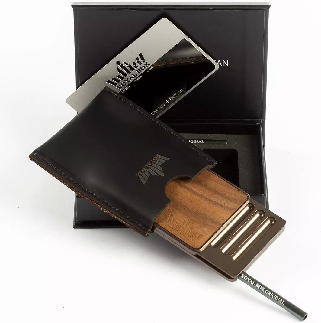 Royal Box - Dozownik do tabaki z rurką WALNUT OLIVE Exclusive Unikalny, ekskluzywny schowek do tabaki Royal Box z podziałką i rurką. Wykonany z najwyższej klasy, szczotkowanego aluminium z wykończeniem w kolorze drewna orzechowego. Zaopatrzony w 8 podziałek do dozowania tabaki. W zestawie 2 aluminiowe rurki.