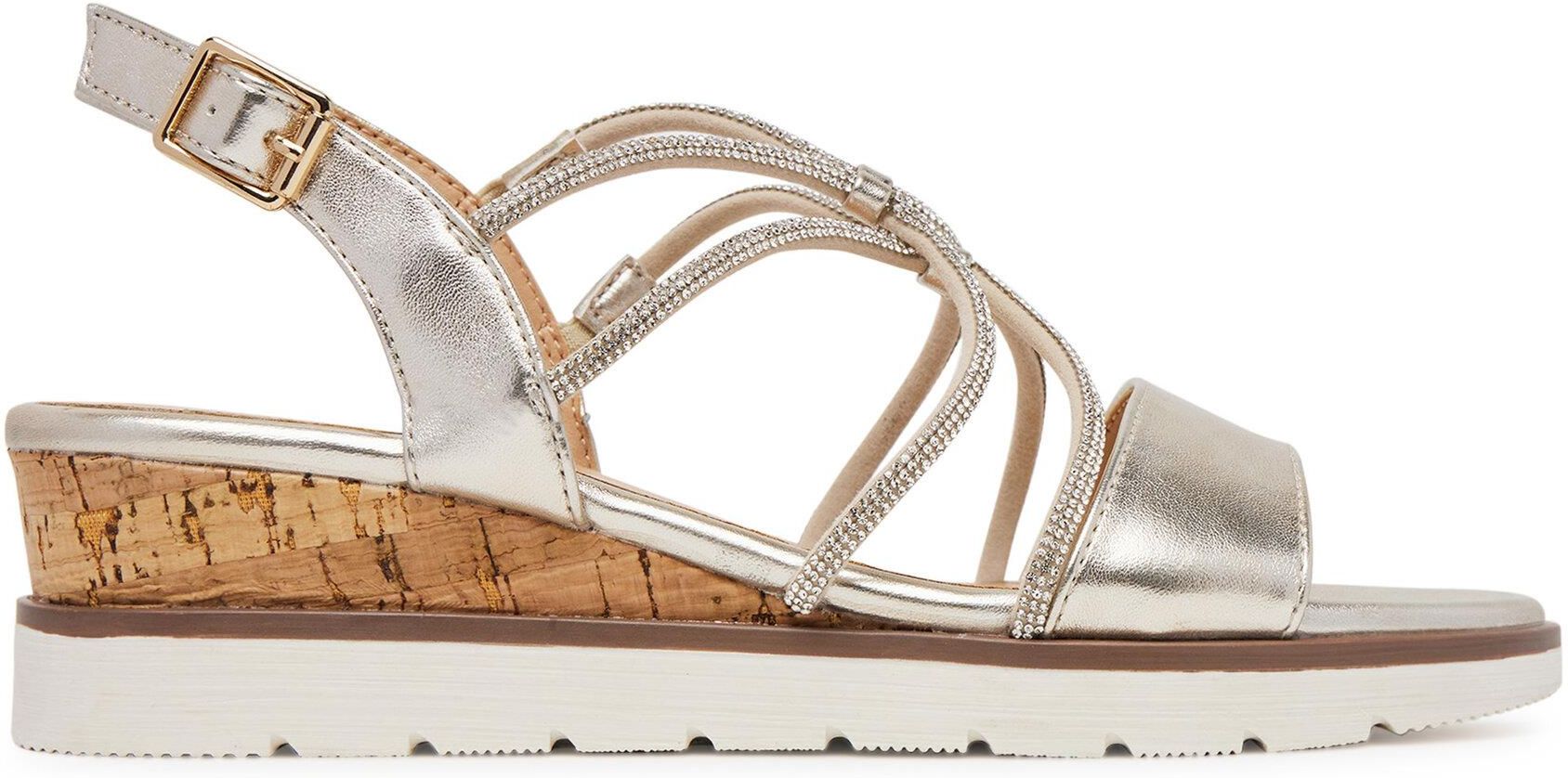 Sandały Clara Barson w złotym kolorze to idealny wybór dla kobiet, które cenią elegancję i wygodę. Wykonane z wysokogatunkowego tworzywa syntetycznego, są trwałe i zapewniają komfort przez cały dzień. Obcas typu koturn optycznie wydłuża sylwetkę, dodając jej smukłości. Zapięcie na sprzączkę zapewnia idealne dopasowanie do stopy, a ozdobne cyrkonie dodają blasku i sprawiają, że sandały stają się wyjątkowym elementem każdej stylizacji. Te sandały to doskonały wybór na letnie dni, zarówno na co dzień, jak i na specjalne okazje. Clara Barson to polska marka, która w każdym sezonie proponuje wygodne i stylowe obuwie damskie, w klasycznych fasonach, które są wzbogacone o nowości ze świata trendów. Marka Clara Barson prezentuje w swojej ofercie przede wszystkim buty, które doskonale dopasowują się do codziennych stylizacji, ale mogą być też perełkami w zestawach na okazje czy wyjątkowe uroczystości. Cechami wyróżniającymi są subtelne fasony i stabilna konstrukcja, które gwarantują przyjemność oraz komfort noszenia. Stonowane kolory, gustowne wykończenie i delikatne dodatki sprawiają, że buty marki Clara Barson chętnie trafiają do damskiej garderoby.