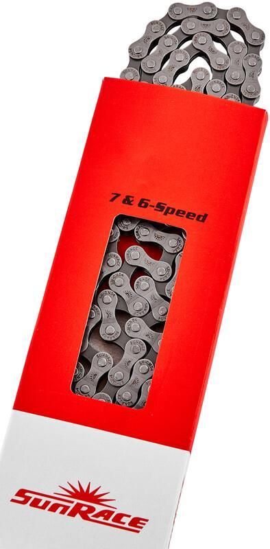 SUNRACE CNM54 - Łańcuch -------------------------------------------------------------- kolor: srebrny 116 ogniw / 6-, 7-, 8-rzędowy wersja BOX (w pudełku) kod produktu ROWERPLUS_PL: 57648 -------------------------------------------------------------- Wytrzymały łańcuch dedykowany do napędów 5-, 6-, 7- oraz 8-rzędowych. Za niezwykle rozsądne pieniądze pozwala cieszyć się szybką zmianą biegów, dobrą żywotnością i wysoką kulturą pracy napędu niezależnie od warunków pogodowych. wykonany w całości ze stali frezowane ogniwa zewnętrzne, ułatwiające szybką zmianę biegów i ograniczające hałas powstający podczas jazdy całkowicie kompatybilny z napędami firmy Shimano oraz pozostałych producentów pasuje zarówno do napędów szosowych, jak i MTB oraz trekkingowych firma SunRace, pochodząca z Tajwanu, od kilkudziesięciu lat ceniona jest za wysoką jakość i niezawodność swoich produktów przy zachowaniu niezwykle rozsądnych cen komponenty SunRace to idealny zamiennik dla części Shimano ze średniej półki cenowej - oferują bardzo dobrą jakość wykonania przy zachowaniu niezwykle korzystnych cen w komplecie pin (sworzeń) do skucia łańcucha oryginalne opakowanie produkt oryginalny, nie pochodzi z demontażu