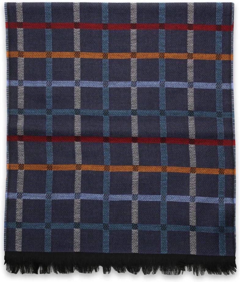 Szal wełniany Kolor: granatowy, kolorowa krata Tkanina: 100% wełna Długość: 190 cm Szerokość: 37 cm Wyprodukowano we Włoszech Elegancki szal w uniwersalnych kolorach. Urozmaici każdą koszulę, kurtkę czy płaszcz. Zakończony krótkimi frędzlami.
