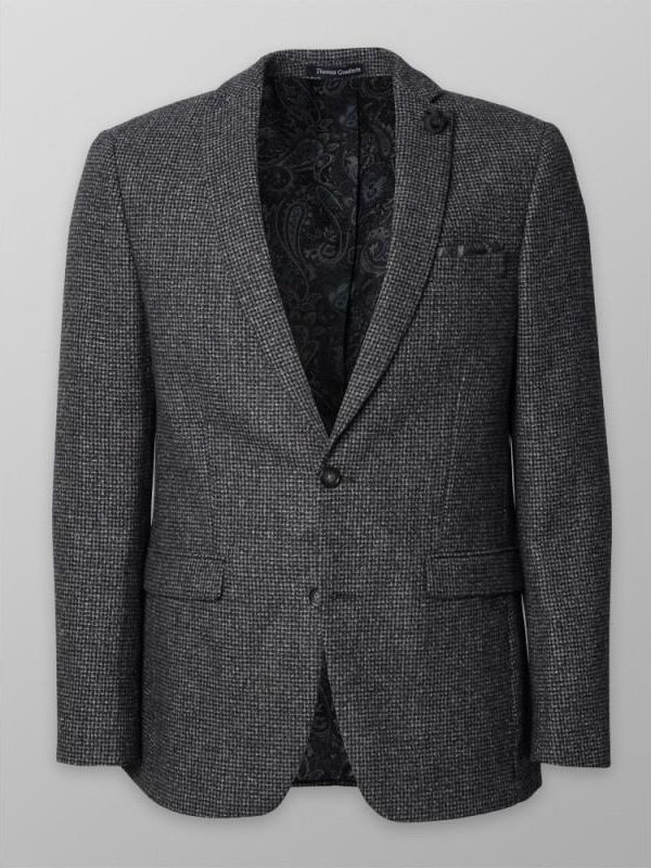 Klasyczna marynarka Gładkie marynarki uszyte z domieszką typowych zimowych tkanin w odcieniach niebieskiego, grafitu i szarości. Pasują na typowe casualowe wyjścia. Poprzez ich gładką fakturę można je zestawiać z mocnymi kolorami i deseniami koszul. Dodatkowe informacje Marynarka w kolorze szarym Tkanina w drobną kratkę Głębokie kieszenie z klapami Zapinana na dwa guziki Klasyczna kieszeń na piersi Wzorzysta podszewka we wzory paisley Posiada ozdobny węzeł w butonierce Skład marynarki 70% poliester 20% wełna10% inne Skład podszewki 100% poliester