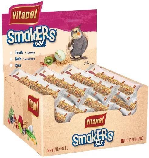 Smakers® pełen smakowitych orzechów, które uzupełniają dietę papug w witaminę E, która działa ochronnie na układ nerwowy i układ odpornościowy, jest doskonałym przeciwutleniaczem. Poza tym orzechy są bogatym źródłem magnezu. Mieszanka paszowa uzupełniająca. Skład: proso żółte (21%), mąka z ziarna pszenicy, proso czerwone, sorgo czerwone (15%), owies łuskany, nasiona krokoszu barwierskiego (9,5%), orzech ziemny obłuszczony (8,5%), siemię lniane. Składniki analityczne: białko surowe (ozn. Met. Kjeldahla) min. 9,8%, tłuszcz surowy min. 5,7%, włókno surowe max. 7,9%, popiół surowy max. 2,7%, wilgotność max. 12%. Podawać jako uzupełnienie i urozmaicenie codziennej dziety.