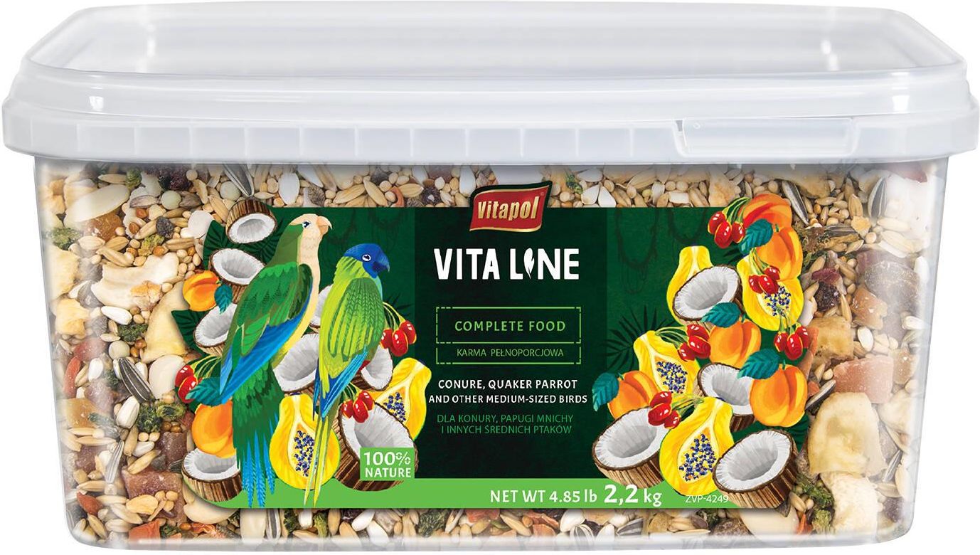 Vitaline karma pełnoporcjowa dla konury, papugi mnichy oraz innych średnich ptaków to idealne połączenie składników tworzących zbilansowaną i odżywczą dietę na każdy dzień. Całkowicie naturalna mieszanka nasion, zbóż, warzyw i owoców, idealna, aby dostarczyć ptakom witamin i minerałów, których potrzebują, aby zachować szczęście i zdrowie. Ze smacznymi kawałkami, które ptaki znajdą na wolności, w tym z bananem, nasionami krokosza barwierskiego, groszkiem, migdałami, morelą, kokosem, orzechami laskowymi.