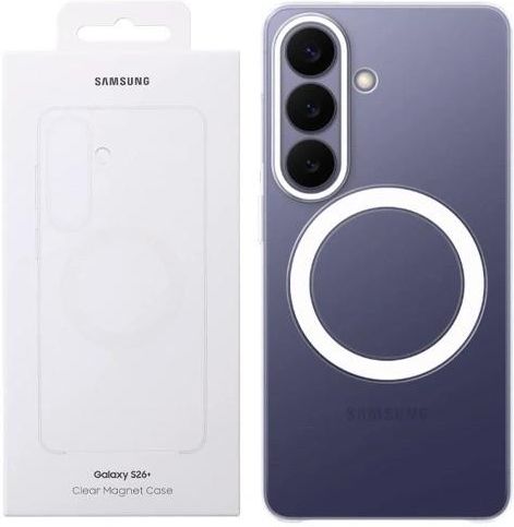 Samsung Galaxy S26+ Clear Magnet Case - przezroczysta ochrona z funkcją magnetyczną Transparentne etui do Samsung Galaxy S26 Plus skutecznie zabezpiecza tył urządzenia i jednocześnie podnosi komfort jego codziennego użytkowania. Wykonane z trwałego tworzywa idealnie dopasowują się do obudowy smartfona, zapewniając skuteczną amortyzację w razie upadku oraz ochronę przed zarysowaniami. Jednocześnie bez zauważalnego zwiększenia objętości telefonu. Klasyczna, przezroczysta konstrukcja Clear Magnet Case podkreśla nowoczesny design Galaxy S26 Plus i eksponuje jego oryginalny wygląd. Akcesorium zostało wyposażone w zintegrowany pierścień magnetyczny, który umożliwia wygodne ładowanie bezprzewodowe oraz korzystanie z kompatybilnych akcesoriów magnetycznych. EAN: 8806097935629 Kod producenta: EF-CS947CTEGWW