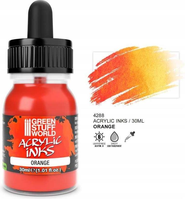 Kryjące farby akrylowe - pomarańczowy Farby akrylowe GSW wyróżniają się innowacyjną formułą, łączącą wysokiej jakości pigmenty w ultrapłynnej bazie akrylowej. Produkty te wyróżniają się szybkim czasem schnięcia, trwałością, wodoodpornością po wyschnięciu i wyjątkową płynnością. Te cechy sprawiają, że są one doskonałym wyborem do różnych technik twórczych, począwszy od szczegółowego malowania figurek lub miniatur w modelarstwie, śledzenia komiksów za pomocą pędzli lub markerów wielokrotnego napełniania, po realizację efektów obrazkowych, które przywołują delikatność akwareli. Chociaż początkowo charakteryzowały się nieprzezroczystością, a tym samym zdolnością do zapewnienia pełnego, solidnego pokrycia bez konieczności rozcieńczania, mogą również oferować pewien stopień przezroczystości, gdy są odpowiednio rozcieńczone. Jednak ich główną siłą jest zdolność do tworzenia gładkich, jednolitych gradientów kolorów. Ta cecha sprawia, że farby kryjące są idealne do zadań wymagających płynnych przejść między odcieniami, takich jak tworzenie tła lub nakładanie warstw bazowych. Ogólnie rzecz biorąc, atramenty te są wyjątkowym wyborem dla artystów, którzy chcą osiągnąć uderzające i spójne efekty kolorystyczne w swojej pracy. Produkt jest sprzedawany w szklanej butelce wyposażonej w pipetę dozującą, która ułatwia precyzyjną kontrolę każdej kropli pigmentu. Funkcja ta pozwala precyzyjnie regulować zarówno ilość, jak i intensywność mieszanek używanych w dziełach sztuki, dając swobodę uchwycenia wizji z niezrównaną wyrazistością i precyzją. Dzięki nieprzezroczystym farbom akrylowym możesz tworzyć wszystko, od subtelnych gradientów po potężne efekty świetlne OSL z wysokimi kontrastami kolorów, eksplorując nieskończoną gamę tonów i odcieni. Ich nieprzezroczystość pozwala na łatwe nakładanie warstw kolorów, tworząc efekty, które zachwycą każdego widza. Główne cechy: Niezwykle napigmentowane. Matowe wykończenia Żywe, płynne i intensywne kolory. Nie jest konieczne rozcieńczanie do użytku z aerografem lub kaligrafią. Silna odporność na światło. Kompatybilny ze wszystkimi innymi produktami GSW, a także z naszymi mediami akrylowymi Dostępna jest szeroka gama kolorów, zarówno nieprzezroczystych, jak i przezroczystych, zaprojektowanych tak, aby spełnić wszystkie wyobrażalne potrzeby twórcze. Zawartość: 1 szklana butelka 30 ml z pipetą dozującą.Indeks pigmentu: PO5Wykończenie: MatowyOdporność na światło (skala niebieskiej wełny): 6 - Bardzo dobra (ASTM I)Nieprzezroczystość: Półprzezroczysty