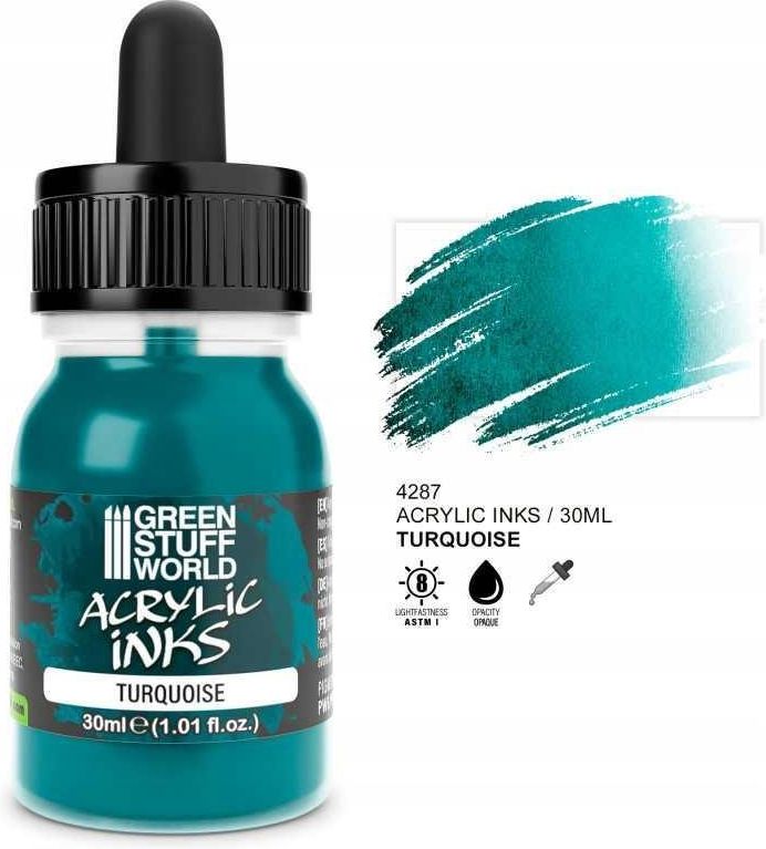 Kryjące farby akrylowe - turkusowy Farby akrylowe GSW wyróżniają się innowacyjną formułą, łączącą wysokiej jakości pigmenty w ultrapłynnej bazie akrylowej. Produkty te wyróżniają się szybkim czasem schnięcia, trwałością, wodoodpornością po wyschnięciu i wyjątkową płynnością. Te cechy sprawiają, że są one doskonałym wyborem do różnych technik twórczych, począwszy od szczegółowego malowania figurek lub miniatur w modelarstwie, śledzenia komiksów za pomocą pędzli lub markerów wielokrotnego napełniania, po realizację efektów obrazkowych, które przywołują delikatność akwareli. Chociaż początkowo charakteryzowały się nieprzezroczystością, a tym samym zdolnością do zapewnienia pełnego, solidnego pokrycia bez konieczności rozcieńczania, mogą również oferować pewien stopień przezroczystości, gdy są odpowiednio rozcieńczone. Jednak ich główną siłą jest zdolność do tworzenia gładkich, jednolitych gradientów kolorów. Ta cecha sprawia, że farby kryjące są idealne do zadań wymagających płynnych przejść między odcieniami, takich jak tworzenie tła lub nakładanie warstw bazowych. Ogólnie rzecz biorąc, atramenty te są wyjątkowym wyborem dla artystów, którzy chcą osiągnąć uderzające i spójne efekty kolorystyczne w swojej pracy. Produkt jest sprzedawany w szklanej butelce wyposażonej w pipetę dozującą, która ułatwia precyzyjną kontrolę każdej kropli pigmentu. Funkcja ta pozwala precyzyjnie regulować zarówno ilość, jak i intensywność mieszanek używanych w dziełach sztuki, dając swobodę uchwycenia wizji z niezrównaną wyrazistością i precyzją. Dzięki nieprzezroczystym farbom akrylowym możesz tworzyć wszystko, od subtelnych gradientów po potężne efekty świetlne OSL z wysokimi kontrastami kolorów, eksplorując nieskończoną gamę tonów i odcieni. Ich nieprzezroczystość pozwala na łatwe nakładanie warstw kolorów, tworząc efekty, które zachwycą każdego widza. Główne cechy: Niezwykle napigmentowane. Matowe wykończenia Żywe, płynne i intensywne kolory. Nie jest konieczne rozcieńczanie do użytku z aerografem lub kaligrafią. Silna odporność na światło. Kompatybilny ze wszystkimi innymi produktami GSW, a także z naszymi mediami akrylowymi Dostępna jest szeroka gama kolorów, zarówno nieprzezroczystych, jak i przezroczystych, zaprojektowanych tak, aby spełnić wszystkie wyobrażalne potrzeby twórcze. Zawartość: 1 szklana butelka 30 ml z pipetą dozującą.Indeks pigmentu: PW6/PB29/PG7Wykończenie: MatoweOdporność na światło (skala niebieskiej wełny): 8 - Doskonała (ASTM I)Nieprzezroczystość: Nieprzezroczysty