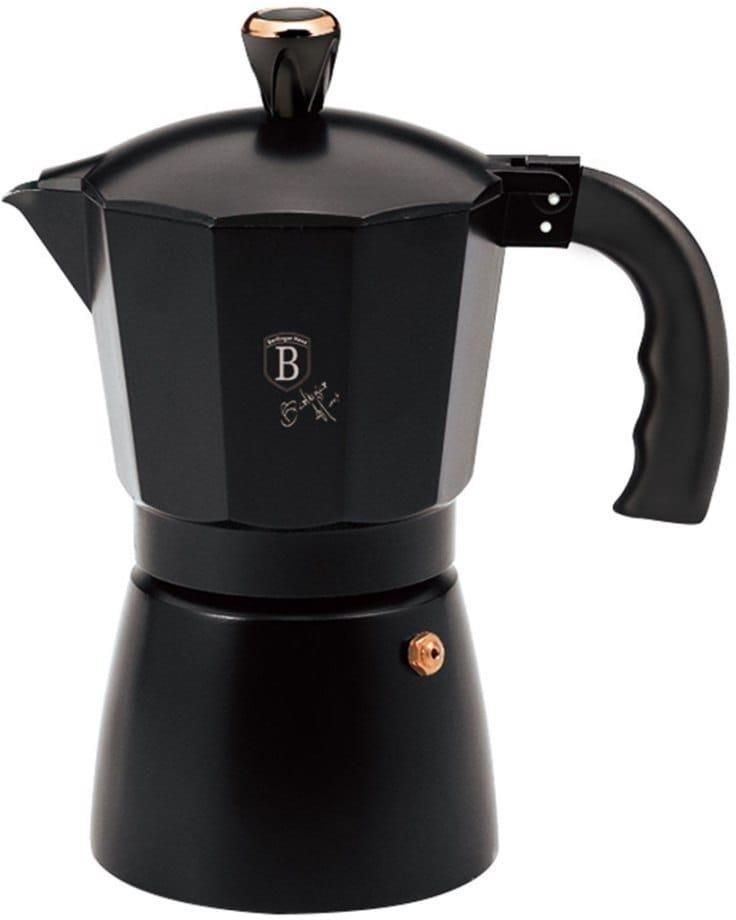Kawiarka na 9 filiżanek BerlingerHaus Black Rose Collection BH-8562 Kawiarka to klasyczne urządzenie do parzenia kawy, które umożliwia przygotowanie aromatycznego espresso w domowych warunkach. Model BH-8562 z kolekcji Black Rose przeznaczony jest do przygotowania 9 filiżanek espresso, co czyni go idealnym rozwiązaniem dla kawoszy. Posiada nienagrzewający się uchwyt z tworzywa. Przystosowana jest do wszystkich rodzajów kuchenek, Z WYJĄTKIEM INDUKCYJNYCH. Cechy produktu: Pojemność: 450ml Materiał: wysokiej jakości aluminium Kolor: czarny z dodatkiem różowego złota Kolekcja: Black Rose Ilość filiżanek: 9 Składa się z 3 elementów: Dolny zbiornik na wodę z zaworem bezpieczeństwa Lejek z sitkiem na zmieloną kawę Górny zbiornik na gotową kawę Instrukcja użytkowania: Do dolnej części kawiarki nalewamy wodę. Następnie zakładamy sitko, po czym do sitka nasypujemy zmieloną kawę (nie ubijamy). Stawiamy na kuchenkę Woda gotując się zmienia się w parę, po czym przechodzi z dolnego zbiornika do góry zaparzając kawę w sitku. Gdy z dolnego otworu usłyszymy świszczenie pary, należy zdjąć kawiarkę z kuchenki. Całkowity czas parzenia trwa 3-4min. Espresso serwowane w małej, ogrzanej przed podaniem filiżance o pojemności ok. 70-100 ml, wypełnia ją do połowy. Porcja kawy espresso to 35 - 50ml napoju.