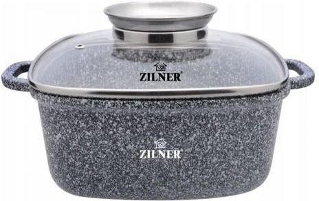 Garnek kwadratowy (brytfanna) 3.5L pokryty marmurową ceramiczną powłoką nieprzywierającą ZILNER. Posiada pokrywkę szklaną z uchwytem Aroma Knob w którym umieszczono dozownik oleju, dzięki któremu podczas gotowania lub duszenia można podawać olej lub płynne przyprawy. Garnek wykonany ze stopu aluminium posiada indukcyjne ferromagnetyczne dno. Jest przystosowany do współpracy z każdym rodzajem kuchni, włącznie z indukcyjną. W komplecie:Garnek z pokrywką szklaną o pojemności ~3.5L, wymiary: 22 x 22 x 10 cm Cechy:Wysoka jakość odlewanego aluminium, odporność na korozję gwarantuje standard mycia,Łatwe i szybkie nagrzewanie,Przystosowane do wszystkich kuchenek halogenowych, ceramicznych, gazowych oraz indukcyjnych,Ceramiczna powłoka nieprzywieralna, o bardzo dużej twardości,Odporne na wysokie temperatury,Szybkie i równomierne rozprowadzanie ciepła, umożliwia gotowanie potraw z małą ilością tłuszczu,
