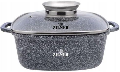 Garnek kwadratowy (brytfanna) 5.5L pokryty marmurową ceramiczną powłoką nieprzywierającą ZILNER. Posiada pokrywkę szklaną z uchwytem Aroma Knob w którym umieszczono dozownik oleju, dzięki któremu podczas gotowania lub duszenia można podawać olej lub płynne przyprawy. Garnek wykonany ze stopu aluminium posiada indukcyjne ferromagnetyczne dno. Jest przystosowany do współpracy z każdym rodzajem kuchni, włącznie z indukcyjną. W komplecie:Garnek z pokrywką szklaną o pojemności ~5.5L, wymiary: 26 x 26 x 11 cm Cechy:Wysoka jakość odlewanego aluminium, odporność na korozję gwarantuje standard mycia,Łatwe i szybkie nagrzewanie,Przystosowane do wszystkich kuchenek halogenowych, ceramicznych, gazowych oraz indukcyjnych,Ceramiczna powłoka nieprzywieralna, o bardzo dużej twardości,Odporne na wysokie temperatury,Szybkie i równomierne rozprowadzanie ciepła, umożliwia gotowanie potraw z małą ilością tłuszczu,