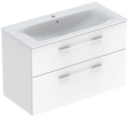 Zestaw umywalki meblowej Geberit Selnova Square, slim, z szafką pod umywalkę, dwie szuflady Zestaw umywalki meblowej Geberit Selnova Square to estetyczne, jakościowe rozwiązanie. Przewodni kolor, którym jest biel – doskonale wpisze się w każdą przestrzeń łazienkową. Co więcej, ta świeża barwa odbija światło, co dodatkowo zwiększa efekt przestronności. Szafka została wykonana z płyty wilgocioodpornej oraz dodatkowo pokryta specjalnym lakierem zabezpieczającym przed blaknięciem. Zachowa swój estetyczny wygląd na długi czas! Będziesz cieszyć się wygodą podczas każdej wizyty w łazience. Dane techniczne Materiał Ceramika sanitarna / sprasowana trójwarstwowa płyta wiórowa Maksymalne obciążenie szuflady 30 kg Charakterystyka Certyfikat FSC™ C134279 Wiszący Cienki rant Z dwoma szufladami Uchwyt do otwierania Szuflada z mechanizmem cichego domykania Wilgocioodporny Dostarczany wstępnie zmontowany Wymiary B: 100 cm B1: 98,8 cm B2: 92 cm B3: 94 cm Szerokość umywalki: 100 cm H: 65,2 cm T: 50,2 cm