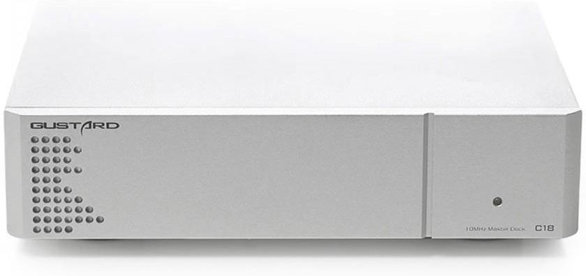 Ten wysokiej klasy zewnętrzny zegar Gustard C18 jest idealny do zapewnienia idealnej synchronizacji cyfrowych sygnałów audio w celu poprawy jakości dźwięku systemu Hi-Fi. C18 wyposażony jest w oscylator o ultra niskim poziomie szumów. OCXO 10MHz Zastosowany tu oscylator to OCXO 10MHz, zaprojektowany tak, aby utrzymywać stałą temperaturę, a tym samym minimalizować zmiany częstotliwości wyjściowej spowodowane zmianami temperatury. Zaprojektowany specjalnie dla audio, pozwala osiągnąć większy poziom szczegółowości, bardziej realistyczną sygnaturę dźwięku i wyższy zakres dynamiczny. Niezależny stopień wyjściowy Obwód wyjściowy C18 utrzymuje i nie pogarsza sygnału o niskim szumie fazowym dostarczanego przez główny oscylator. GDRV-P1 może również dostarczyć zarówno sygnał sinusoidalny, jak i kwadratowy, aby dostosować się do różnych urządzeń. Dyskretne zasilanie C18 posiada dyskretny obwód zasilania klasy A, który jest wysoce wydajny, zapewniając niskie zniekształcenia i szybką odpowiedź.