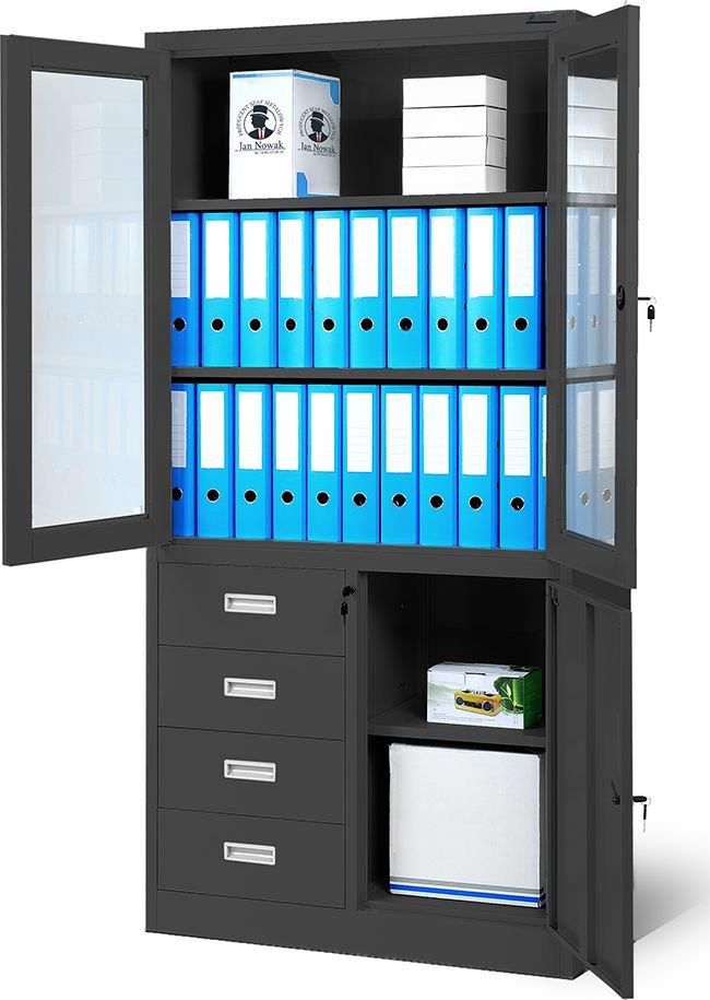Biurowa przeszklona szafa metalowa na akta z szufladami WIOLA, 900x1850x400 mm, antracytowa Antracytowa szafa JAN NOWAK model WIOLA – metalowa, 90 cm, na akta, dokumenty, do biura, do urzędu, do gabinetu WIOLA – metalowa szafa biurowa Stalowa szafa do biura w kolorze antracytowym, posiadająca zamek …