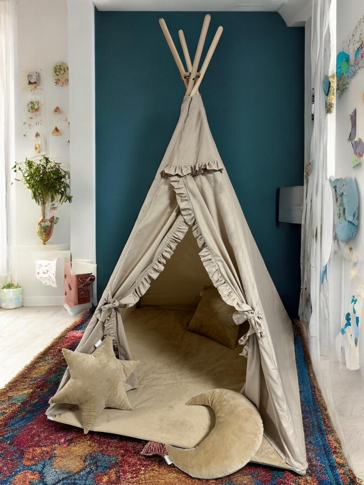 Przenieś pokój dziecięcy w świat kreatywnej zabawy i przytulności dzięki eleganckiemu namiotowi tipi! Wyposażony w dekoracyjne okienko, stanie się wyjątkowym miejscem dla Twojego malucha – idealnym do zabawy, odpoczynku i tworzenia niezapomnianych chwil.