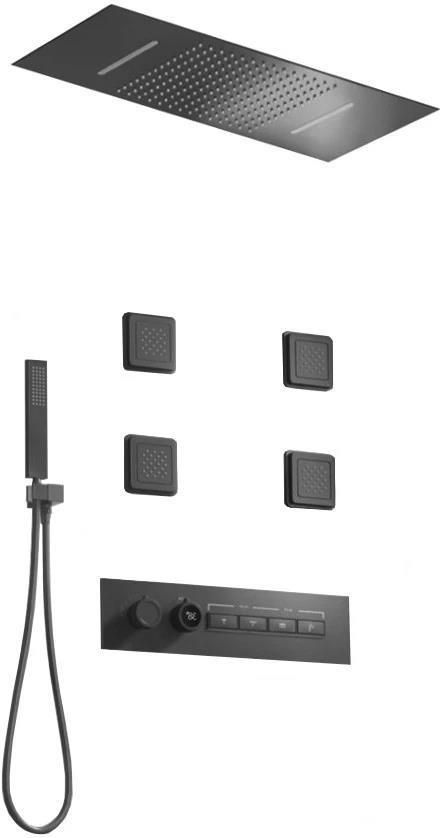 Specyfikacja produktu: Materiał: Stal nierdzewna Kolor: Czarny Ilość funkcji: 3 Słuchawka prysznicowa 1-funkcyjna Wąż z osłoną ze stali nierdzewnej 150 cm Cztery podtynkowe dysze boczne Deszczownica ze strumieniem deszczowym oraz kaskadowym Dysze silikonowe Anti-Calc ułatwiają usuwanie kamienia …