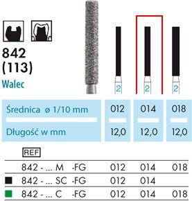 Doskonałej jakości wiertła diamentowe - walce 842 na turbinę, produkcji niemieckiej firmy NTI-Kahla GmbH. W cenie tutaj podanej, o średnicy 012, 014,018. W uziarnieniu średnim M i zgrubnym C. Legenda: Uziarnienie wierteł diamentowych: M bez pierścienia średni 107-126 µm ISO 524 SC Pierścień czarny wstępnie zgrubny 181 µm ISO 544 C Pierścień zielony zgrubny 151 µm ISO 534 F Pierścień czerwony drobny 40 µm ISO 514 SF Pierścień żółty bardzo drobny 20 µm ISO 504 UF Pierścień biały ultradrobny 15 µm ISO 494 FG – turbina FGL i FGXL – turbina przedłużona FGM – mikroturbina RA – kątnica RAL – przedłużona kątnica HP – prostnica