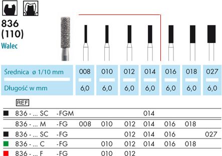 Dentystyczne, doskonałej jakości wiertła diamentowe - walce 836 na turbinę, produkcji niemieckiej firmy NTI-Kahla GmbH. W cenie tutaj podanej, o średnicach 010-014. W uziarnieniu wstępnie zgrubnym SC, zgrubnym C, średnim i drobnym.
