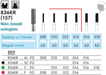 Doskonałej jakości wiertła diamentowe - walce 836KR z lekko zaokrąglonymi kantami na turbinę, produkcji niemieckiej firmy NTI-Kahla GmbH. W cenie tutaj podanej, w średnicach 010-014. W uziarnieniu zgrubnym C i wstępnie zgrubnym SC. Legenda: Uziarnienie wierteł diamentowych: M bez pierścienia średni 107-126 µm ISO 524 SC Pierścień czarny wstępnie zgrubny 181 µm ISO 544 C Pierścień zielony zgrubny 151 µm ISO 534 F Pierścień czerwony drobny 40 µm ISO 514 SF Pierścień żółty bardzo drobny 20 µm ISO 504 UF Pierścień biały ultradrobny 15 µm ISO 494 FG – turbina FGL i FGXL – turbina przedłużona FGM – mikroturbina RA – kątnica RAL – przedłużona kątnica HP – prostnica