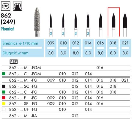 Doskonałej jakości wiertła diamentowe - płomienie 862 016, 018 na turbinę, produkcji niemieckiej firmy NTI-Kahla GmbH. W cenie niżej podanej, o średnicy 016, 018. W uziarnieniu drobnym F, średnim M i bardziej zgrubnym SC. Legenda: Uziarnienie wierteł diamentowych: M bez pierścienia średni 107-126 µm ISO 524 SC Pierścień czarny wstępnie zgrubny 181 µm ISO 544 C Pierścień zielony zgrubny 151 µm ISO 534 F Pierścień czerwony drobny 40 µm ISO 514 SF Pierścień żółty bardzo drobny 20 µm ISO 504 UF Pierścień biały ultradrobny 15 µm ISO 494 FG – turbina FGL i FGXL – turbina przedłużona FGM – mikroturbina RA – kątnica RAL – przedłużona kątnica HP – prostnica