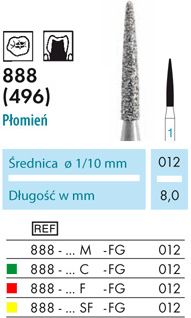 Doskonałej jakości wiertła diamentowe - płomienie 888 012 na turbinę, produkcji niemieckiej firmy NTI-Kahla GmbH. Średnica - 012. Uziarnienie - zgrubne C i średnie M. Cenę podano wyżej. Legenda: Uziarnienie wierteł diamentowych: M bez pierścienia średni 107-126 µm ISO 524 SC Pierścień czarny wstępnie zgrubny 181 µm ISO 544 C Pierścień zielony zgrubny 151 µm ISO 534 F Pierścień czerwony drobny 40 µm ISO 514 SF Pierścień żółty bardzo drobny 20 µm ISO 504 UF Pierścień biały ultradrobny 15 µm ISO 494 FG – turbina FGL i FGXL – turbina przedłużona FGM – mikroturbina RA – kątnica RAL – przedłużona kątnica HP – prostnica