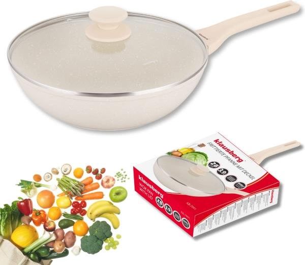 Klausberg KB-7991 to elegancka patelnia WOK o średnicy 28 cm, wyposażona w pokrywkę i zaprojektowana z myślą o wygodnym, zdrowym gotowaniu. Wysokie ścianki oraz pojemność około 3,9 litra sprawiają, że bez trudu przyrządzisz w niej pełne dania: warzywa stir-fry, makarony, mięsa, zupy, a także …