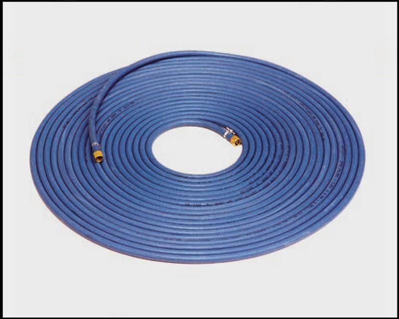 Wąż WT-25 do tlenu. Długość 25m, średnica wewn. 6,3mm, przyłącza z gwintem G1/4. SZCZEGÓŁY Węże gumowe do tlenu (klasy normalnej 2 MPa (20 bar); wykonanie zgodne z PN-EN ISO 3821:2010) typu WT w kolorze niebieskim, wyposażone są w przyłącza wg PN-EN 560:2007. ZASTOSOWANIE Węże przeznaczone są do doprowadzania tlenu do palników i urządzeń spawalniczych.