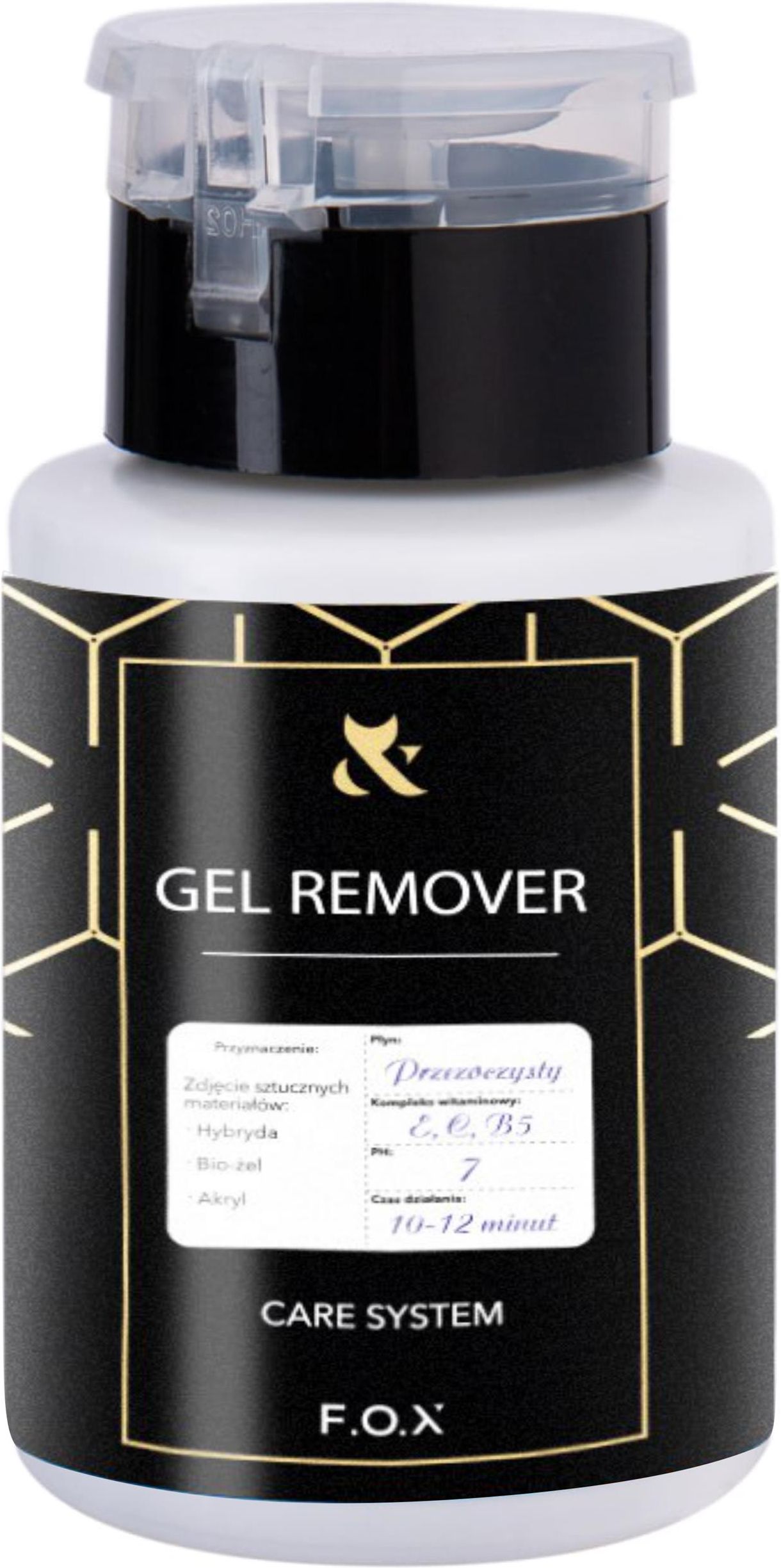 Płyn do usuwania lakieru, hybrydy, żelu F.O.X Gel Remover Gel remover to płyn, którego można używać do usuwania lakieru, hybrydy oraz żelu. Dzięki zawartości witamin E, C i B5 Gel Remover chroni skórę rąk podczas wykonywania zabiegów, zapewnia doskonałe nawilżenie płytki paznokcia oraz naskórka i zapobiega powstawaniu białych plam i rozwarstwieniom. Remover F.O.X. Care system, 160 ml z pompką ZALETY ma delikatny, przyjemny zapach nie powoduje reakcji alergicznych JAK UŻYĆ 1. Z pomocą pilnika spiłuj górną warstwę lakieru hybrydowego. 2. Nałóż F.O.X Gel Remover na płatek kosmetyczny lub bezpyłowy wacik. 3. Następnie owiń każdy paznokieć folią aluminiową (możesz użyć zwykłej folii spożywczej pociętej na małe kwadraty o krawędzi około 8 cm) i poczekaj 10-12 minut; 4. Usuń folię oraz resztki lakieru za pomocą drewnianego patyczka do manicure lub kopytka do odsuwania skórek. Ważne jest, aby robić to delikatnie. Zdejmij folię z jednego paznokcia i usuń resztki lakieru. Kolejnym paznokciem zajmij się dopiero po zakończeniu pracy z poprzednim. 5. Wyrównaj powierzchnię paznokcia za pomocą polerki. Czas aplikacji: 10 - 12 minut Tylko do użytku profesjonalnego. Proszę uważnie przeczytać sposób użycia. Unikać kontaktu z oczami. Unikać kontaktu ze skórą. Może powodować reakcję alergiczną. Zaprzestać stosowania przy wystąpieniu podrażnienia. Przechowywać z dala od dzieci. SKŁAD Acetone, Ethyl Acetate.