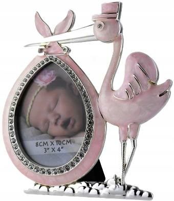 Prezent z okazji urodzin dziecka lub Chrztu Św. Ramka Bocian Prezentowana ramka ma uroczy kształt bociana trzymającego pieluchę. Ten kształt i kolor jest dedykowany dziewczynką. Ramkę można postawić na komodzie, parapecie lub półce w dziecięcym pokoju. Obdarowanemu maluchowi też z pewnością się spodoba, zwłaszcza, gdy zdjęcie będzie już w środku. Ramka może być symbolicznym upominkiem dla dziecka, które dopiero przyszło na świat, prezentem na chrzest, czy też pierwsze urodziny. Może także stanowić dodatek do większego podarunku lub przysłowiowej "koperty". Wymiary zdjęcia: 8 x 10 cm. Kolor: Chromowany metal, kolory emalii - różowy, białe kryształki. Opakowanie: Oryginalne estetyczne pudełko.
