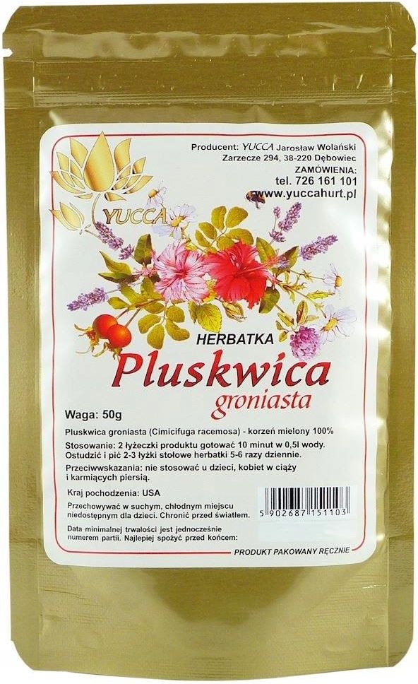 SKŁADNIKI Pluskwica groniasta - korzeń mielony 100% STOSOWANIE 2 łyżeczki produktu gotować 10 minut w 0,5l wody. Ostudzić i pić 2-3 łyżki stołowe herbatki 5-6 razy dziennie. Nie stosować u dzieci i kobiet w okresie ciąży i karmienia piersią. PRZECHOWYWANIE Przechowywać w suchym i chłodnym miejscu, niedostępnym dla dzieci. Chronić przed światłem.