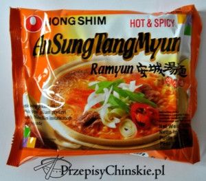 AnSung TangMyun | Koreańska Pikantna Zupa Instant "AnSungTangMyun Noodle Soup | Hot & Spicy Ramyun" 125g NONGSHIM AnSung TangMyun od Nongshim to popularna propozycja koreańskiej marki Nongshim, pikantna zupa typu instant o smaku ostrej wołowiny. Pikantna zupa to propozycja dla prawdziwych wyjadaczy koreańskiej kuchni (dla niewtajemniczonych "hot" w koreańskich produktach nijak się ma do naszego rozumienia ostrości). Pikantna zupa na bazie sprężystego makaronu, w aromatycznym wołowym bulionie, z dodatkiem warzyw i przypraw: cebuli, czosnku, papryki i kolendry. To właśnie dobór jakościowych składników, odpowiada za doskonały smak produktów od Nongshim. W Korei, błyskawiczne potrawy tego typu jak Ansong Tangmyun, są najczęściej uzupełnianie o świeże dodatki, takie jak warzywa, mięso, owoce morza, grzyby i nawet krakersy ryżowe. Ta zupa jest podstawą dla wielu dalekowschodnich dań i często jest nazywana "ramyun". Klasyczny sposób przygotowania zupy ramyun podajemy poniżej. Pamiętajcie jednak, że to "baza", do której według upodobań możecie dodać swoje ulubione składniki: mięso, warzywa, jajka czy pierożki :)! Sposób przygotowania: Zagotować 550 ml wody. Do wrzątku wrzucić makaron oraz zawartość paczuszek z przyprawami. Gotować przez 5 minut na średnim ogniu. Zamieszać i podawać na gorąco. Smacznego! Waga netto: 125g Skład: Makaron: mąka pszenna (USA), skrobia ziemniaczana, olej palmowy, mąka ryżowa, gluten pszenny, sól, regulatory kwasowości: E501, E500, E339; płynny tokoferol (przeciwutleniacz: E306; emulgator: E322 (zawiera soję)), substancja zagęszczająca: E412; przyprawa (maltodekstryna, ekstrakt z czosnku, substancja słodząca: E420), ekstrakt z zielonej herbaty (oligosacharydy, katechiny, regulator kwasowości: E330), barwnik: E101. Przyprawa do zupy: przyprawa (hydrolizowane białko roślinne (soja, pszenica), maltodekstryna, sól, ekstrakt z drożdży, pieprz czarny, grzyby), sól, cukier, przyprawa (czerwona papryka chili, czosnek, olej ryżowy, pieprz czarny), suszone algi, wzmacniacze smaku: E631, E627; suszona czerwona papryka chili, karmel w proszku (maltodekstryna, barwnik: E150c). Wartość odżywcza / 100g: wartość energetyczna 1779kJ/423kcal, tłuszcz 14g (w tym nasycone 7g), węglowodany 66g (w tym cukry 2,9g), białko 8,2g, sól 4,7g. Kraj pochodzenia: Korea Południowa