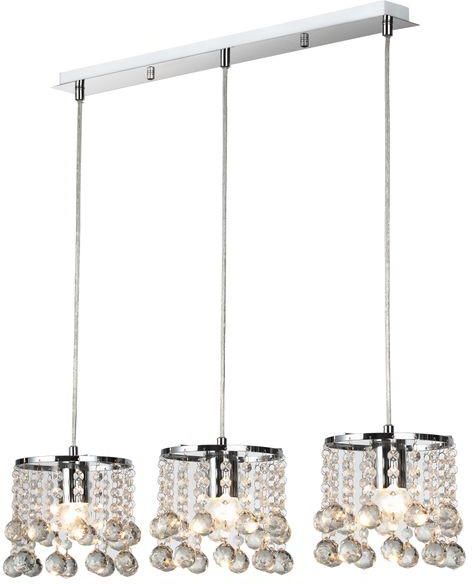 LAMPA WISZĄCA CHROM Z KRYSZTAŁKAMI PARAMETRY: Rodzaj: Lampa wisząca Kolor: Chrom Ilość źródeł światła: 3 Rodzaj gwintu: E14 Maksymalna moc: 3x40W max Wysokość [cm]: 100 ( można skrócić) Szerokość [cm]: 75 Głębokość [cm]: 19 Materiał wykonania: Metal Klosz: Zawiesia kryształ IP: 20