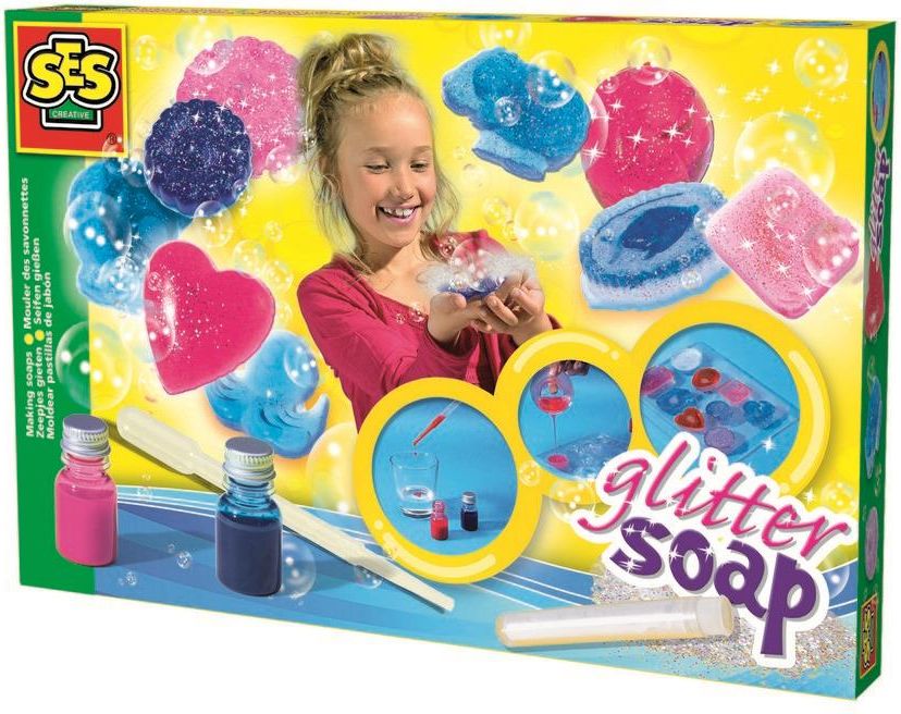 Zestaw do samodzielnego zrobienia kolorowych mydełek z brokatem. Gotowe mydła są bezpieczne i można wykorzystać je do mycia lub ozdobienia łazienki. Mydełka maja delikatny zapach i bardzo dobrze się pienią. W skład zestawu wchodzi: bezbarwna gliceryna, dwa pachnące barwniki : czerwony i niebieski (można je mieszać), pipeta, brokat, forma do wykonania 9 mydełek, kolorowa instrukcja obrazkowa. Zabawka odpowiednia dla dzieci w wieku 7+. Zalecana pomoc osoby dorosłej. Wyprodukowano w Holandii.