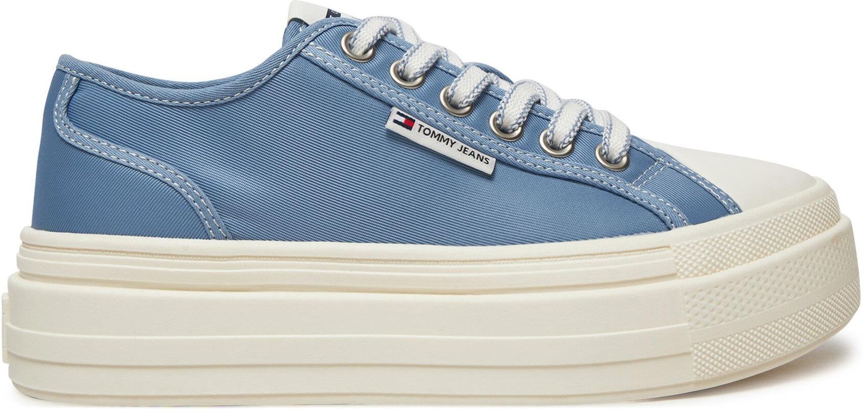 Niebieskie trampki Tommy Jeans to doskonały wybór dla kobiet ceniących nowoczesny styl i wygodę. Wykonane z wytrzymałego materiału, łączą w sobie modny wygląd z praktycznością. Flatformowa konstrukcja na koturnie i platformie dodaje subtelnej wysokości, jednocześnie zapewniając stabilność i komfort noszenia. Twarda wyściółka gwarantuje solidne wsparcie dla stóp, co sprawia, że trampki sprawdzą się idealnie na co dzień, jak i w bardziej wyjątkowych stylizacjach. Postaw na unikalny design i wszechstronność z trampkami Tommy Jeans – musisz je mieć w swojej kolekcji!