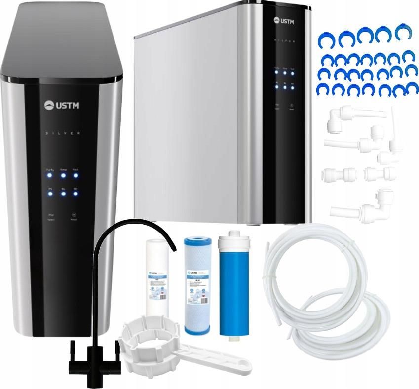 System odwróconej osmozy UST-M Silver Black Style Zestaw zawiera Oczyszczacz wody Instrukcję obsługi Zawór wlotowy wody Wylewka w kolorze black (czarny mat) Rurkę PE Przyłącze odpływowe 2x Złączka do wylewki Membranę RO Wkład piankowy PS Blok węglowy BL Zasilacz Klucz Trzystopniowy system filtracji …
