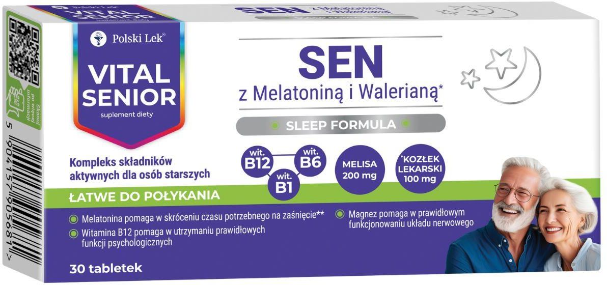 Dzięki składnikom VITAL SENIOR SEN zadbasz o spokojniejszy rytm wieczoru i łatwiejsze przygotowanie do snu. Składniki: substancja wypełniająca: celuloza; węglan magnezu; ekstrakt z ziela melisy lekarskiej (Melissa officinalis L.); substancja wypełniająca: sorbitole; ekstrakt z korzenia kozłka lekarskiego (Valeriana officinalis); substancja przeciwzbrylająca: poliwinylopirolidon; substancje glazurujące: hydroksypropylometyloceluloza, hydroksypropyloceluloza; substancja przeciwzbrylająca: glikol polietylenowy; skrobia; stabilizator: estry sacharozy i kwasów tłuszczowych; cyjanokobalamina; chlorowodorek pirydoksyny; chlorowodorek tiaminy; melatonina; barwniki: tlenki i wodorotlenki żelaza, kwas karminowy. Sposób użycia: Tabletkę należy połknąć i popić wodą. Zaleca się spożywać 2 tabletki dziennie. Nie przekraczać zalecanej porcji do spożycia w ciągu dnia. Suplementy diety nie mogą być stosowane jako substytut (zamiennik) zróżnicowanej diety. Zrównoważona dieta i zdrowy tryb życia są istotne dla zachowania zdrowia . Opakowanie: Masa netto: 21 g (30 tabletek powlekanych) * Melatonina pomaga w skróceniu czasu potrzebnego na zaśnięcie. ** Magnez pomaga w utrzymaniu prawidłowych funkcji psychologicznych oraz prawidłowym funkcjonowaniu układu nerwowego. Suplementy diety nie mogą być stosowane jako substytut (zamiennik) zróżnicowanej diety. Należy pamiętać, że zrównoważony sposób żywienia i zdrowy tryb życia mają istotne znaczenie.