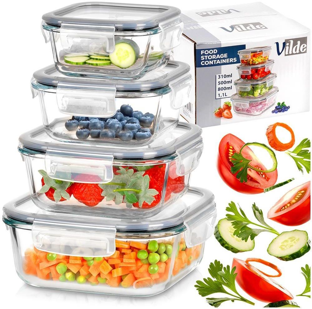 Zestaw 4 pojemników kuchennych w różnych rozmiarach. Idealne do przechowywania żywności oraz produktów sypkich. Wykonane ze szkła, pokrywka jest szczelna dzięki uszczelce. Zestaw 4 pojemników na żywność - Zestaw 4 szt. pojemników kuchennych z pokrywkami do przechowywania żywności i produktów sypkich. W zestawie pojemniki w czterech różnych rozmiarach. Pojemniki można wygodnie przechowywać umieszczając je w największym pojemniku. Wykonane ze szkła borokrzemowego - Pojemnik wykonany z odpornego na wysokie temperatury szkła borokrzemowego. Pokrywka wykonana z najwyższej jakości, przezroczystego tworzywa, posiada silikonową uszczelkę w kolorze czarnym. Przezroczysty kolor pozwoli na wygodne sprawdzenie zawartości pojemnika, bez konieczności otwierania go. Szczelne zamknięcie - Pokrywki są wyposażone w cztery solidne zatrzaski, które umożliwiają pewne zamknięcie. Dodatkowo, pokrywki posiadają uszczelkę, która zapewnia szczelność i świeżość przechowywanych produktów. Uniwersalne zastosowanie - Pojemniki świetnie sprawdzą się do przechowywania oraz przenoszenia żywności. Możemy umieścić w nich dowolną żywność. Idealne do przechowywania sypkich produktów, wędlin, sałatek, owoców, różnego rodzaju potraw czy przekąsek. Pojemniki możemy wykorzystać także do przechowywania różnego rodzaju akcesoriów. Nadają się do zmywarki, mikrofalówki i zamrażarki, piekarnika - Pojemniki nadają się do mycia w zmywarce do naczyń, podgrzewania potraw w mikrofalówce (bez pokrywki) oraz do zapiekania potraw w piekarniku (bez pokrywki). Możemy również mrozić w nich potrawy w zamrażarce. Pojemniki odporne na temperaturę od -30°C do 450°C, a pokrywki odporne są na temperaturę od -20°C do 100°C . Zestaw pojemników kuchennych w różnych rozmiarach. W zestawie 1x pojemnik o wymiarach 17,5 x 17,5 x 7,5 cm i pojemności 1,1 l, 1x pojemnik o wymiarach 14,5 x 14,5 x 7 cm i pojemność 800 ml, 1x pojemnik o wymiarach 12,5 x 12,5 x 6,5 cm i pojemności 500 ml, 1x pojemnik o wymiarach 11 x 11 x 5,5 i pojemności 310 ml. Przydatne w każdej kuchni. Pozwolą na odpowiednie przechowywanie produktów, wprowadzając ład i porządek do kuchni. Oryginalny produkt marki Vilde. Wyprodukowano zgodnie z europejskimi