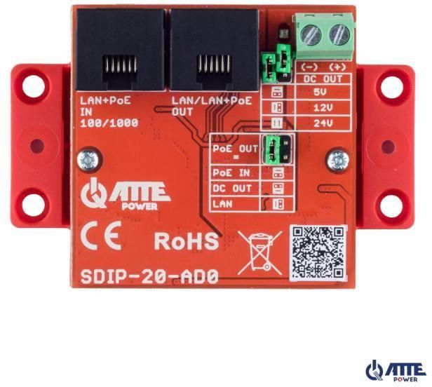 Adapter PoE Gigabit Ethernet obniżający napięcie Vout 5V/12V/24V, Pout max 20W 802.3at/af oraz PASSIVE Adapter SDIP-20-AD0 przeznaczony jest do zasilania dodatkowych urządzeń poprzez linię PoE lub obniżenie napięcia PoE obecnego we wtyku RJ45 przy przepustowości 10/100/1000Mbps. Odpowiednie kombinacje zworek pozwalają na wybór właściwej konfiguracji zasilania POE na wyjściu jak i poziomu napięcia wyjściowego z przetwornicy. Jeden zestaw zworek pozwala wybrać wartość napięcia wyjściowego DC przetwornicy na poziomie 5V, 12V lub 24V. Drugi zestaw zworek odpowiada za konfigurację zasilania dostępnego w porcie wyjściowym LAN. Pozwala na przeniesienie na wyjście zasilania PoE z wejścia, obniżeniu napięcia PoE do ustawionego zworkami w przetwornicy lub wyłączeniu zasilania i pozostawieniu tylko transmisji LAN. Adapter jest przeznaczony do współpracy ze switchem PoE pracującym w standardzie 802.3at/af lub PoE PASSIVE.Urządzenie posiada bardzo małe rozmiary co pozwala na łatwą zabudowę w niewielkich przestrzeniach. Dodatkowe kołki montażowe lub adapter pozwalają na montaż w obudowach ABOX lub na szynie TH35. NAJWAŻNIEJSZE CECHY: port wejściowy jak i wyjściowy zapewniają transmisję LAN (LAN + PoE) z prędkością 1000 Mbps w jednym urządzeniu łączymy funkcjonalności całej rodziny przetwornic serii ASDC-12-xx-HS Uwagi instalacyjne: Sumaryczna moc pobierana przez podłączone do adaptera odbiorniki nie może przekroczyć budżetu mocy oferowanego przez switch zasilający. Przed podłączeniem odbiornika należy się upewnić jaki jest właściwy poziom napięcia PoE oraz na których parach powinno zostać podane zasilanie. Przed podłączeniem odbiorników PoE PASSIVE (np. anteny WiFi) upewnij się, że wartość napięcia oraz polaryzacja na pinach RJ45 switcha lub adaptera zasilającego są zgodne z wartościami dopuszczanymi przez odbiornik. Podanie niewłaściwego napięcia zasilającego, błędnej polaryzacji lub dobór złych par zasilających może skutkować niestabilną pracą lub w niektórych przypadkach uszkodzeniem urządzenia DANE TECHNICZNE: Obsługiwane zasilacze PoE 802.3 at/af RJ45 Port 10/100/1000MbpsPASSIVE PoE RJ45 Port 10/100/1000Mbps Złącza 2x RJ45 Port 10/100/1000MbpsNapięcie wyjściowe Vout – terminal połączeniowy DC OUT Napięcie wyjściowe DC OUT 5 VDC / 12 VDC / 24 VDC +/-5% ustawiane zworkąPoE OUT brak / 5 VDC / 12 VDC / 24 VDC +/-5% ustawiane zworkąPINY PoE: 4,5 (V+) 7,8 (V-) PassivePoE Moc wyjściowa DC OUT max. 20W Napięcie wejściowe 44 ... 56 VDC (PoE)PINY PoE: 1,2 (V-) 3,6 (V+) 4,5 (V+) 7,8 (V-) Zabezpieczenia Zabezpieczenie przeciążeniowe przetwornicy 2A z auto powrotem Sygnalizacja LED czerwona - obecność napięcia wyjściowego Konstrukcja obudowy Podstawa montażowa uniwersalna, kołki montażowe, szyna TH35 z dodatkowym uchwytem, możliwość przykręcenia do płaskiej powierzchni Stopień ochrony IP20 Zakres temperatur pracy -25°C ... +50°C Wymiary 51 x 51 (73)x 21 mm Waga 0,031 kg PRZYKŁADY ZASTOSOWAŃ: Zasilanie urządzenia Passive PoE 24V z linii PoE 48V Zasilanie punktu dostępowego AP Passive PoE 24V z linii PoE 48V Zasilanie urządzeń dodatkowych napięciem 12V z linii PoE Zastosowanie przetwornicy do zasilania kamery IP bez PoE z 12V Zasilanie z linii PoE kamery IP PoE oraz dodatkowych urządzeń 12V - mikrofon Zasilanie z linii PoE kamery IP oraz dodatkowych urządzeń 12V - stacja bramowa, przekaźnik, sygnalizator