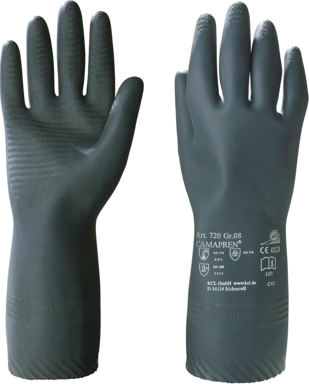 Rękawice chemoodporne KCL Camapren 720, w całości wykonane z lateksu naturalnego z dodatkiem chloroprenu, doskonale chronią dłonie przed kontaktem z substancjami chemicznymi. Welurowa wyściółka gwarantuje najwyższy komfort noszenia, a teksturowana powierzchnia pewny chwyt mokrych i zaolejonych przedmiotów. Wydłużone, elastyczne mankiety chronią przed dostaniem się zanieczyszczeń i chemikaliów do wnętrza rękawic. Wysoka elastyczność rękawic, nawet w niskich temperaturach, zapewnia doskonałe wyczucie i najwyższy poziom manualności. Rękawice robocze KCL Camapren 720 stanowią doskonałą barierę ochronną przed przenikaniem wirusów, bakterii i grzybów oraz są odporne na oleje, tłuszcze i substancje chemiczne. Właściwości produktu: Wysoka elastyczność nawet w niskich temperaturach Welurowa wyściółka Wysoka odporność na oleje, tłuszcze oraz substancje chemiczne Ochrona przed bakteriami, grzybami i wirusami Ochrona przed zagrożeniami chemicznymi Wydłużone, elastyczne mankiety Doskonały chwyt mokrych i zaolejonych powierzchni Wysoki komfort noszenia Doskonałe wyczucie przedmiotów Najwyższy poziom manualności AQL 0,65 Zastosowanie: Przemysł chemiczny Prace porządkowe Laboratoria Przemysł motoryzacyjny Czyszczenie i konserwacja Do użytku domowego Materiał: Lateks naturalny z dodatkiem chloroprenu Dostępne rozmiary: 7 - 11 Opakowanie zbiorcze: 100 par w kartonie (10 par w opakowaniu) Normy i certyfikaty: EN 420 | EN 388 [1111X] | EN 374
